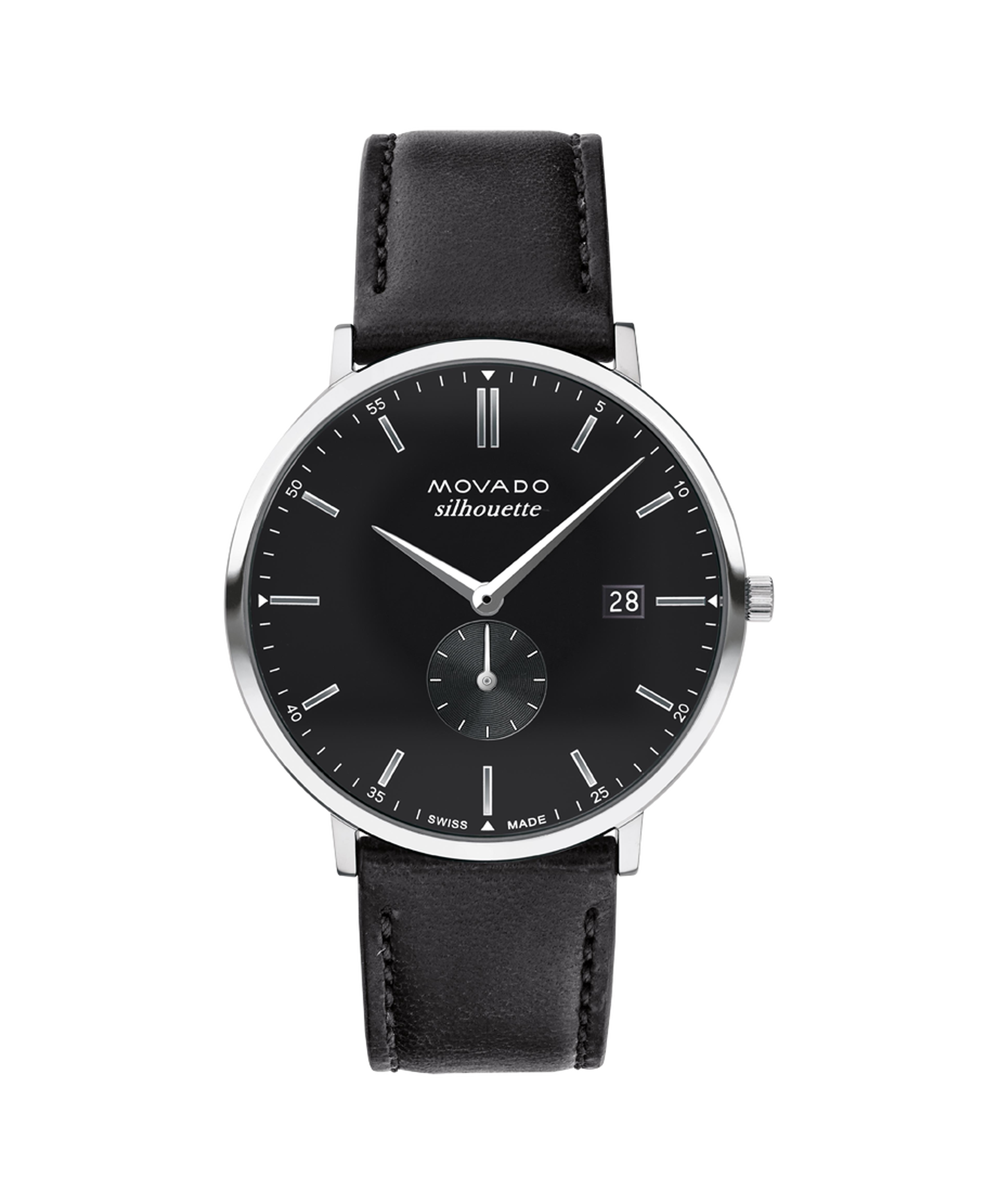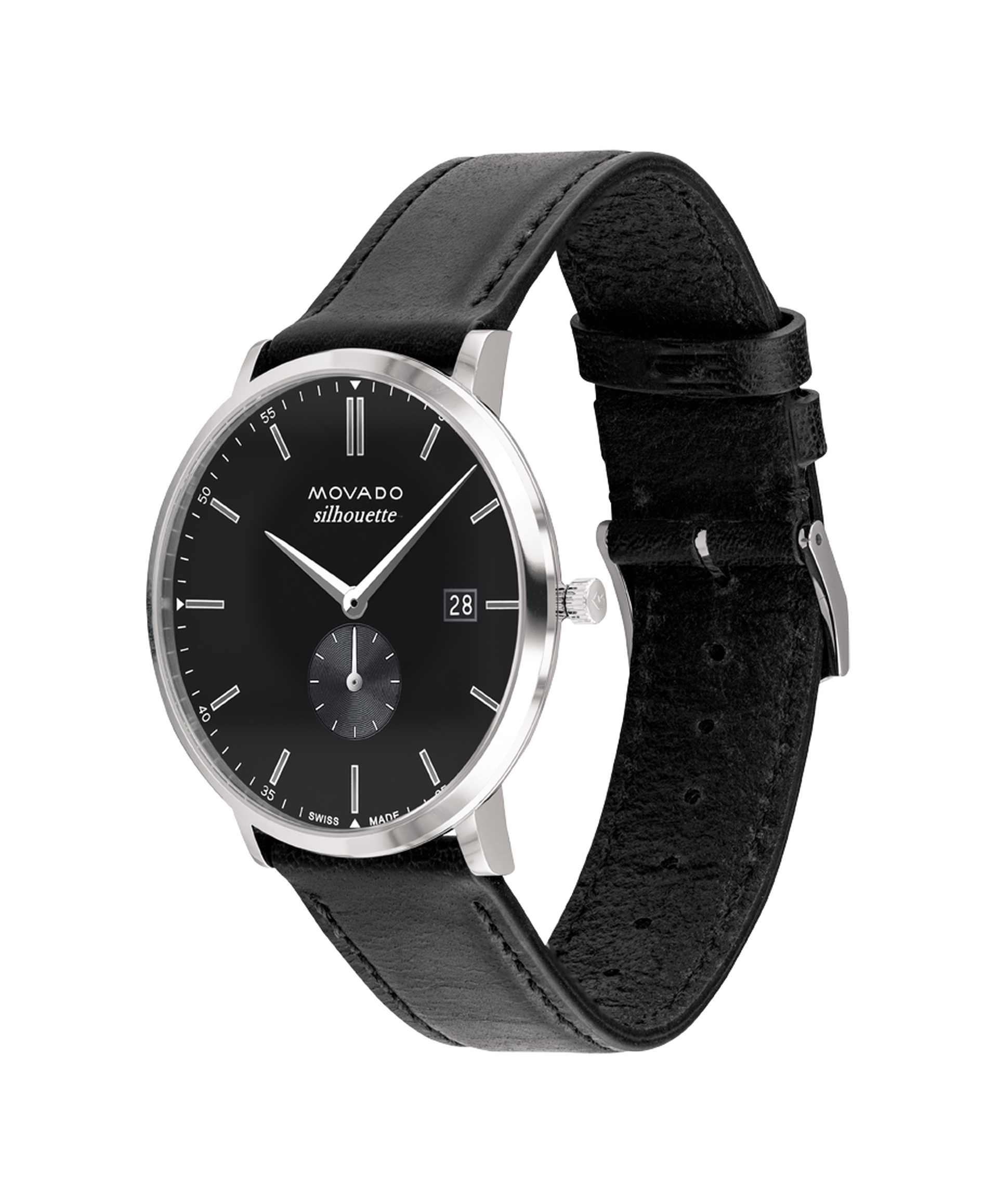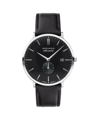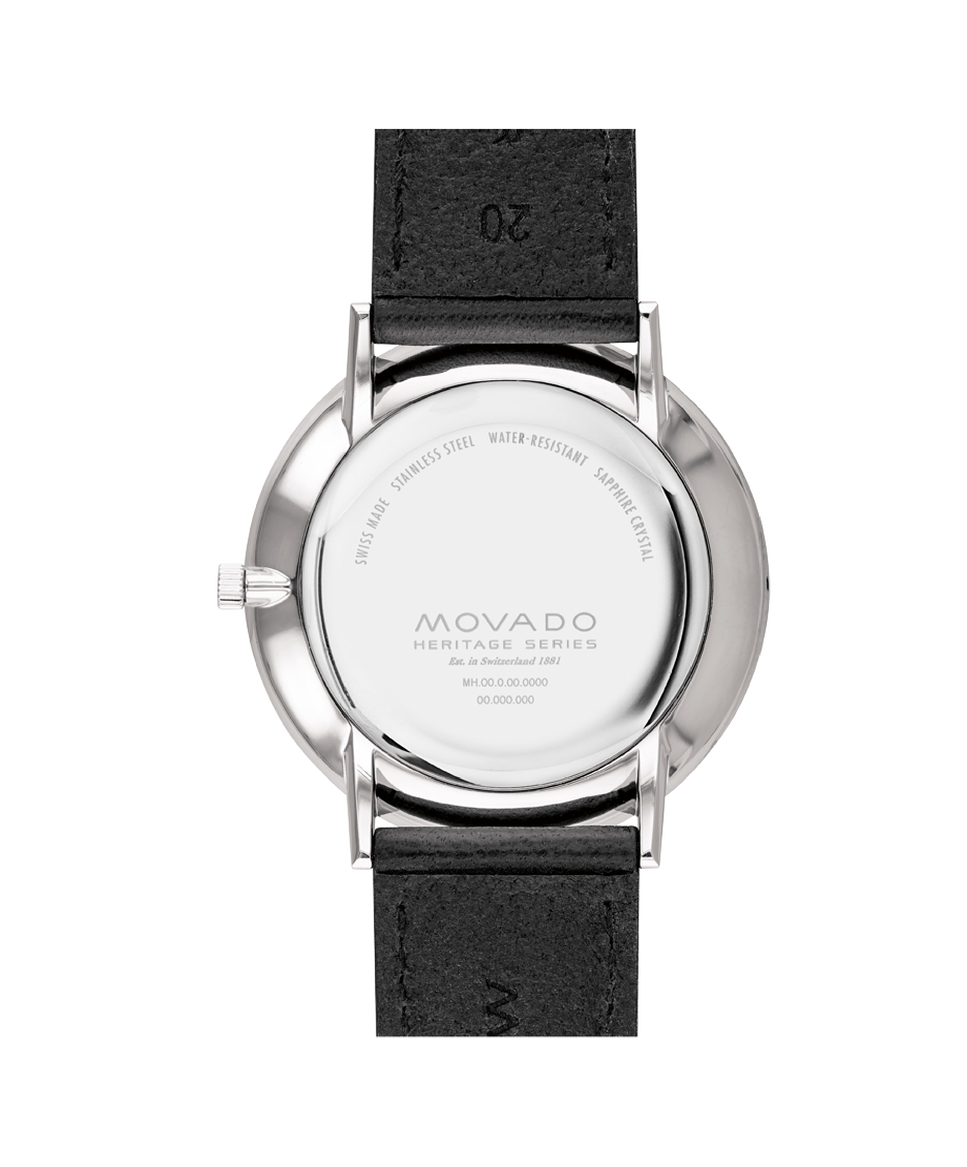 Men's Movado Heritage Series Calendoplan watch, 40 mm stainless steel case with fluidly extended lugs, round black 2-hand dial with sub dial, luminescent silver-toned hands and applied markers, printed white minute index, and date display,Black top-stitched leather strap with classic stainless steel buckle.
