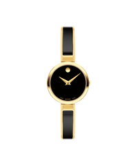 Redefining modern elegance. Iconic design meets feminine style in our new Moda Collection. This sophisticated bangle features a slim yellow gold PVD-finished bracelet and sleek black ceramic inlay paired with a chic 24mm case framing our signature Museum dial.