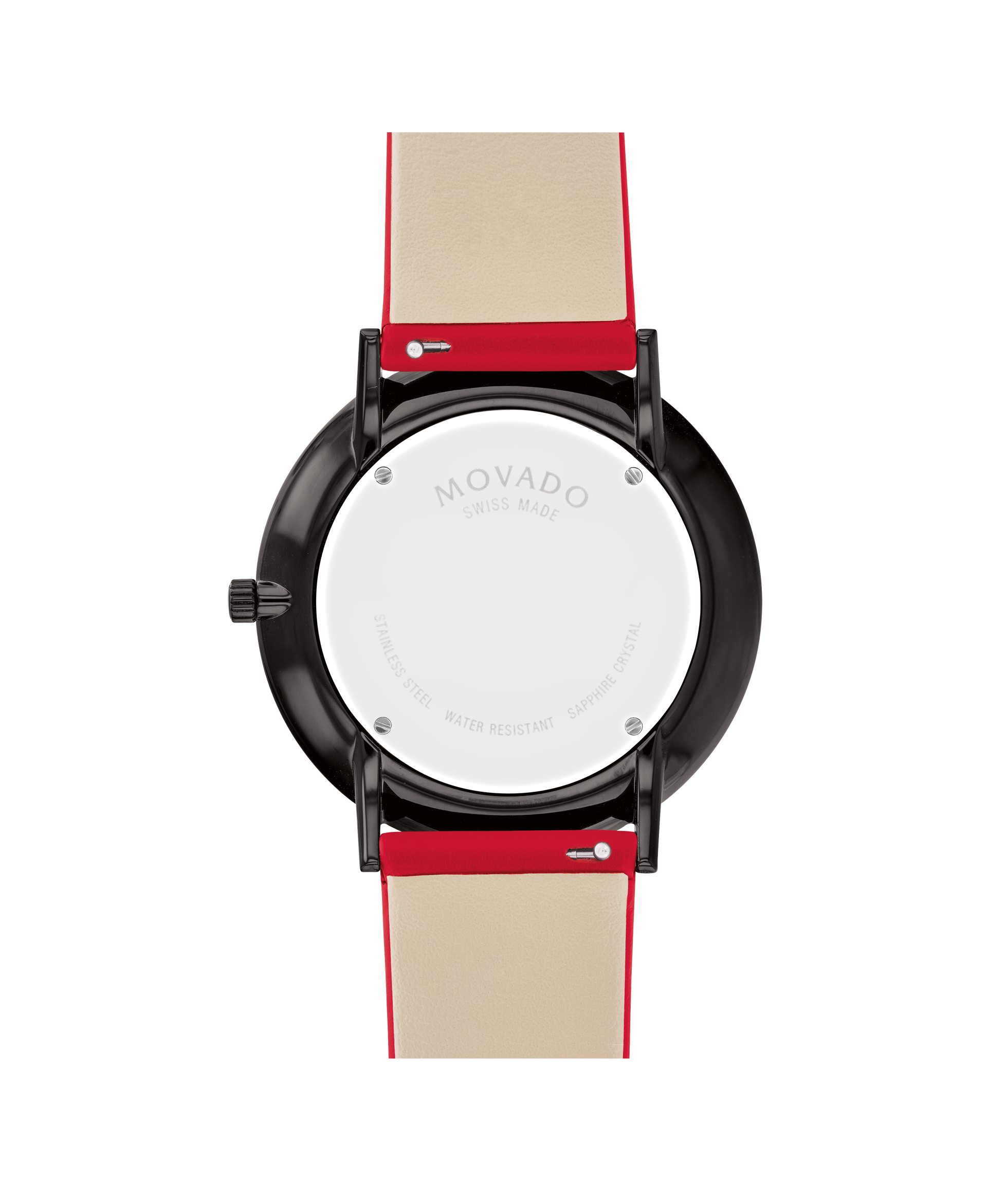 Movado.com EXCLUSIVE Modern 47, 40 mm black PVD-finished stainless steel case with red-toned dial on red leather strap.