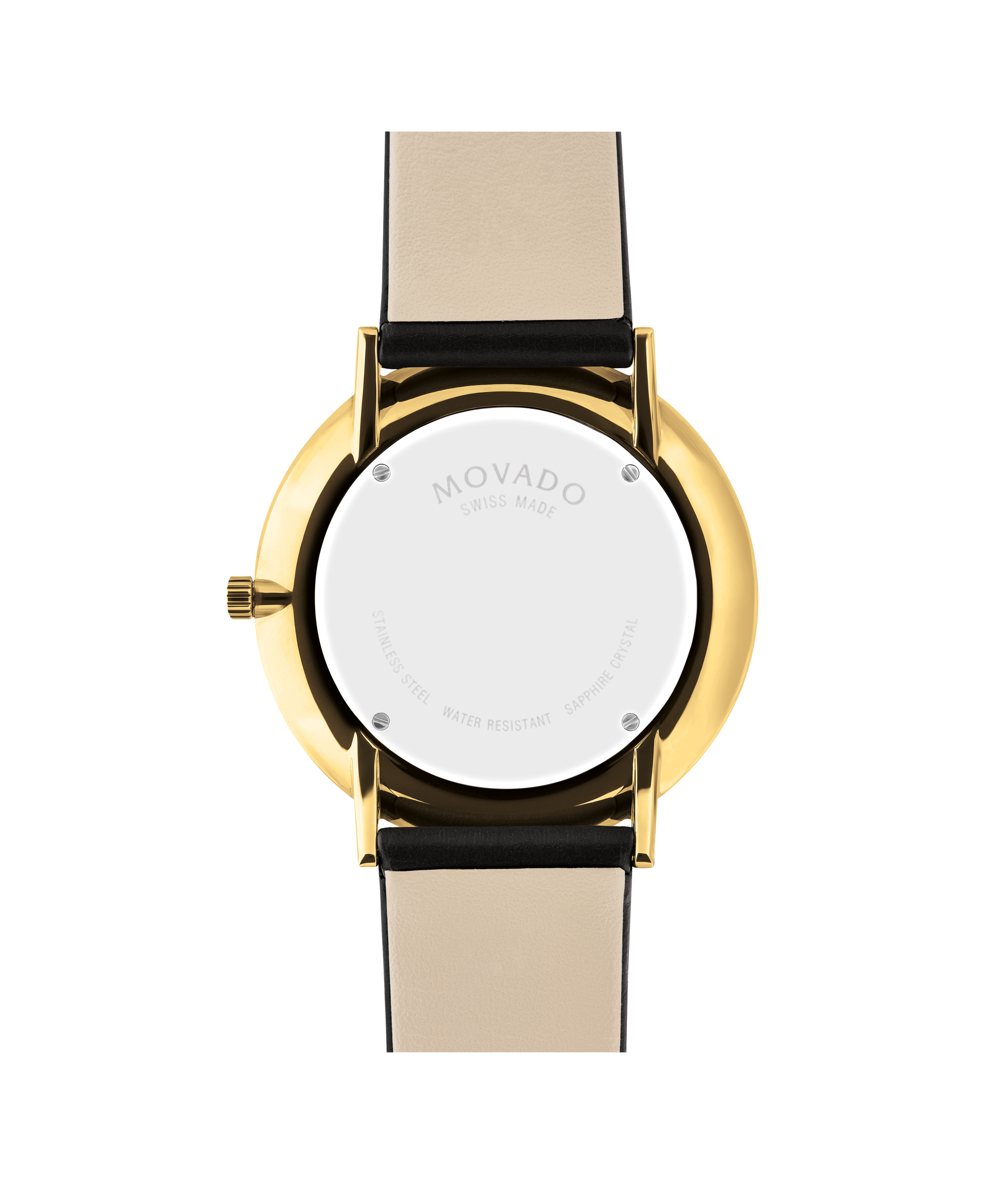 Movado.com EXCLUSIVE Modern 47, 40 mm yellow gold PVD-finished stainless steel case with black-toned dial on black leather strap.