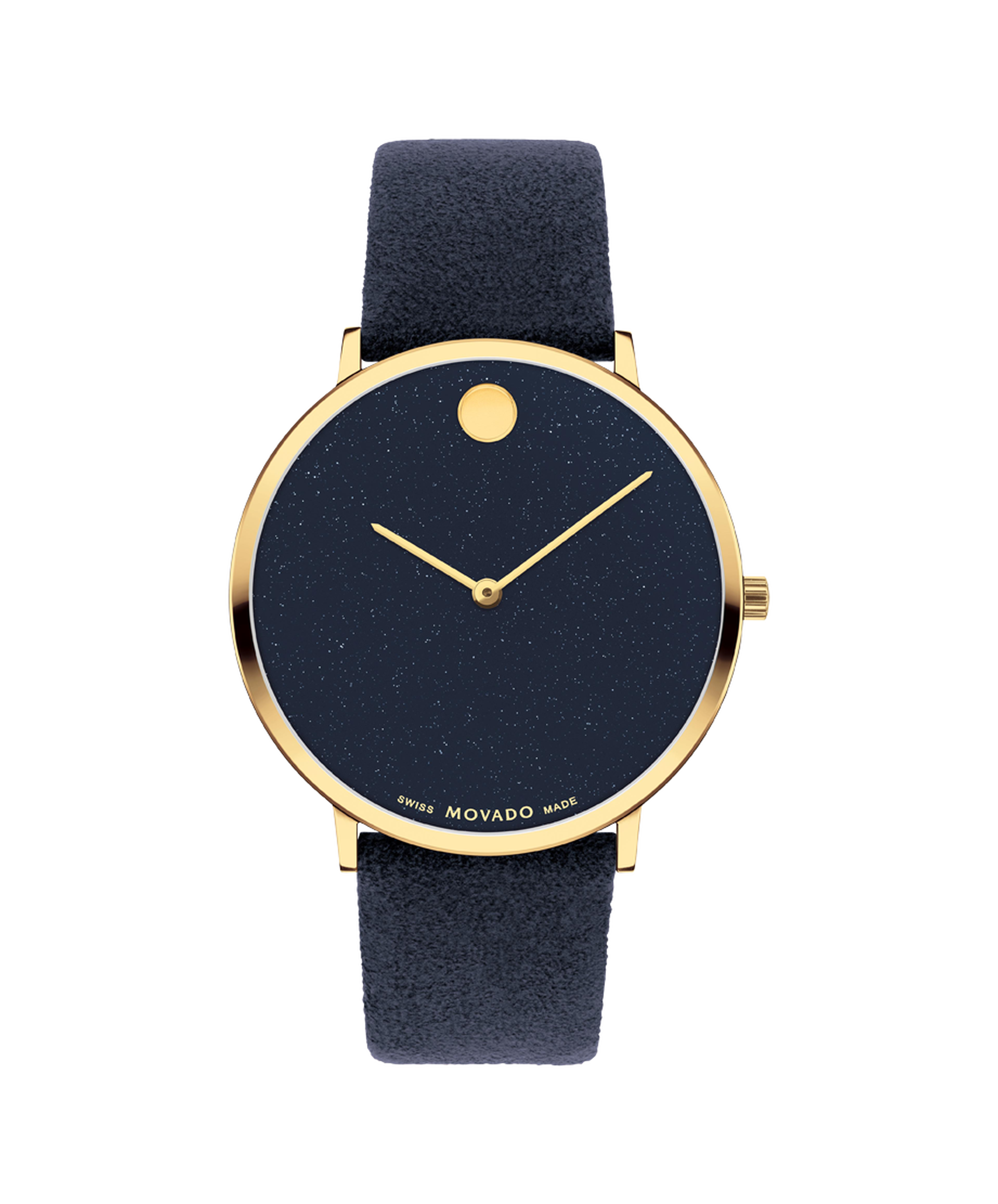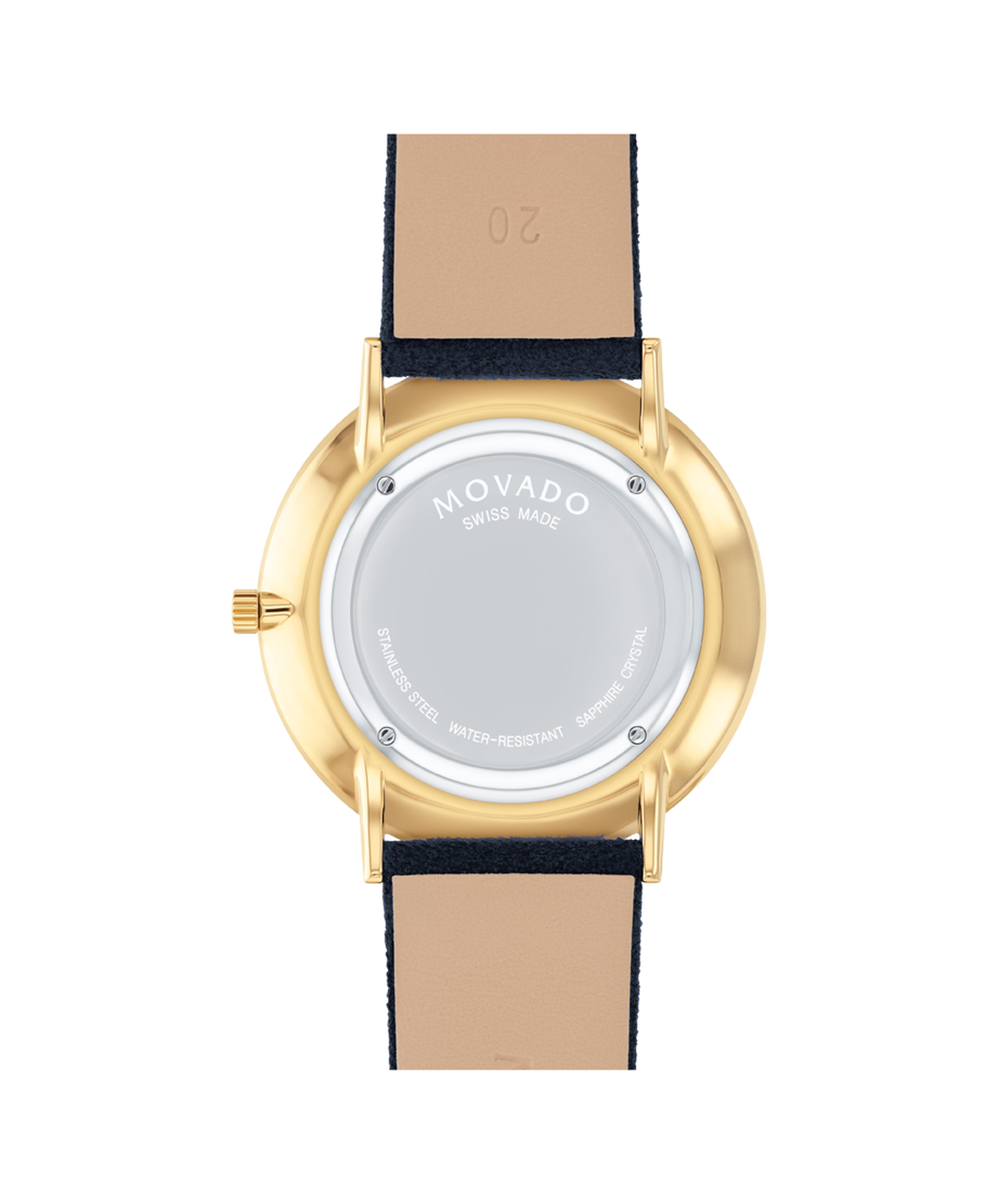 Movado.Com Exclusive -The Modern 47 is a modern exploration of our iconic Museum Dial, introduced in 1947. This 40mm watch features a blue shimmer dial, slim yellow gold-tone hands, and our signature dot at 12 o'clock.