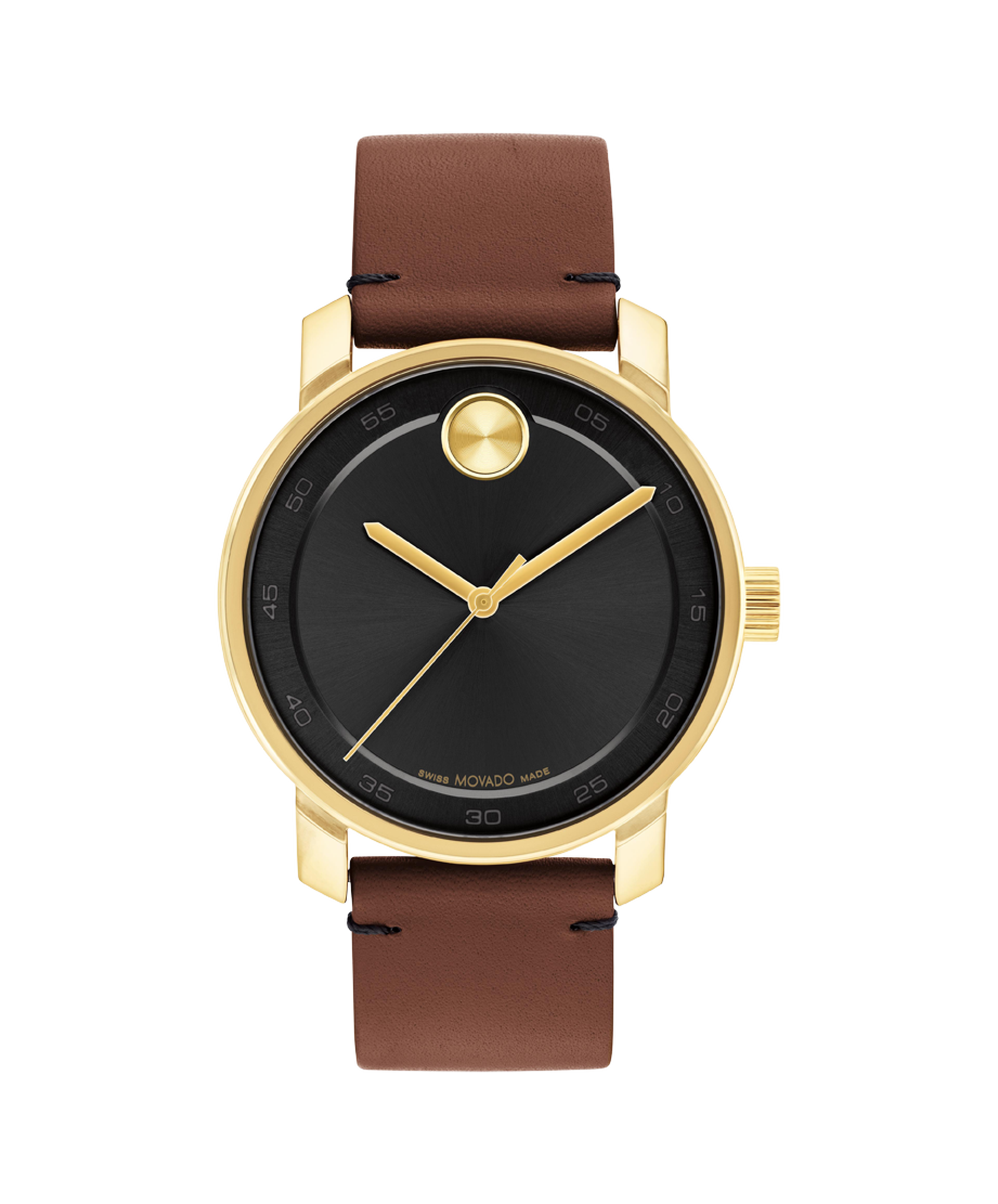 Movado BOLD Access, 41mm yellow gold ion-plated stainless steel case with black dial, yellow gold-toned dot & hands on a cognac strap.