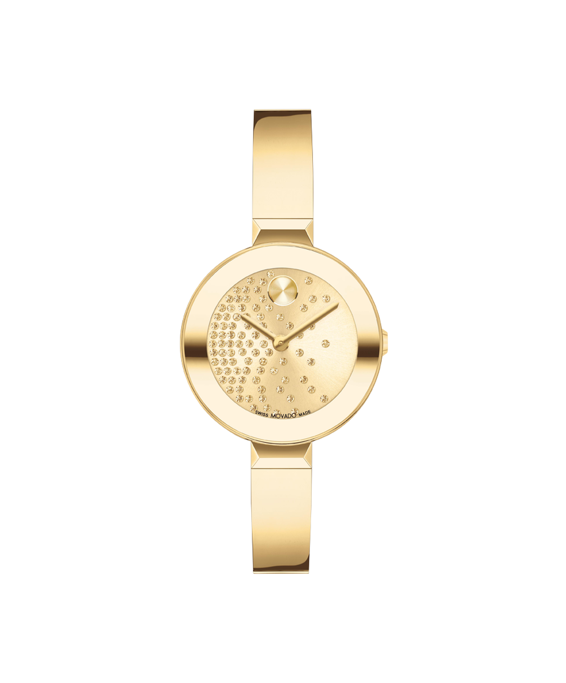 The evolution of modern design with a sharp look and elevated feel. This ultra-chic bangle watch is crafted from yellow gold-toned ion-plated stainless steel with a 28mm case that houses a sparkling crystal spray dial plus slim hands and our iconic dot motif at 12 o’clock.