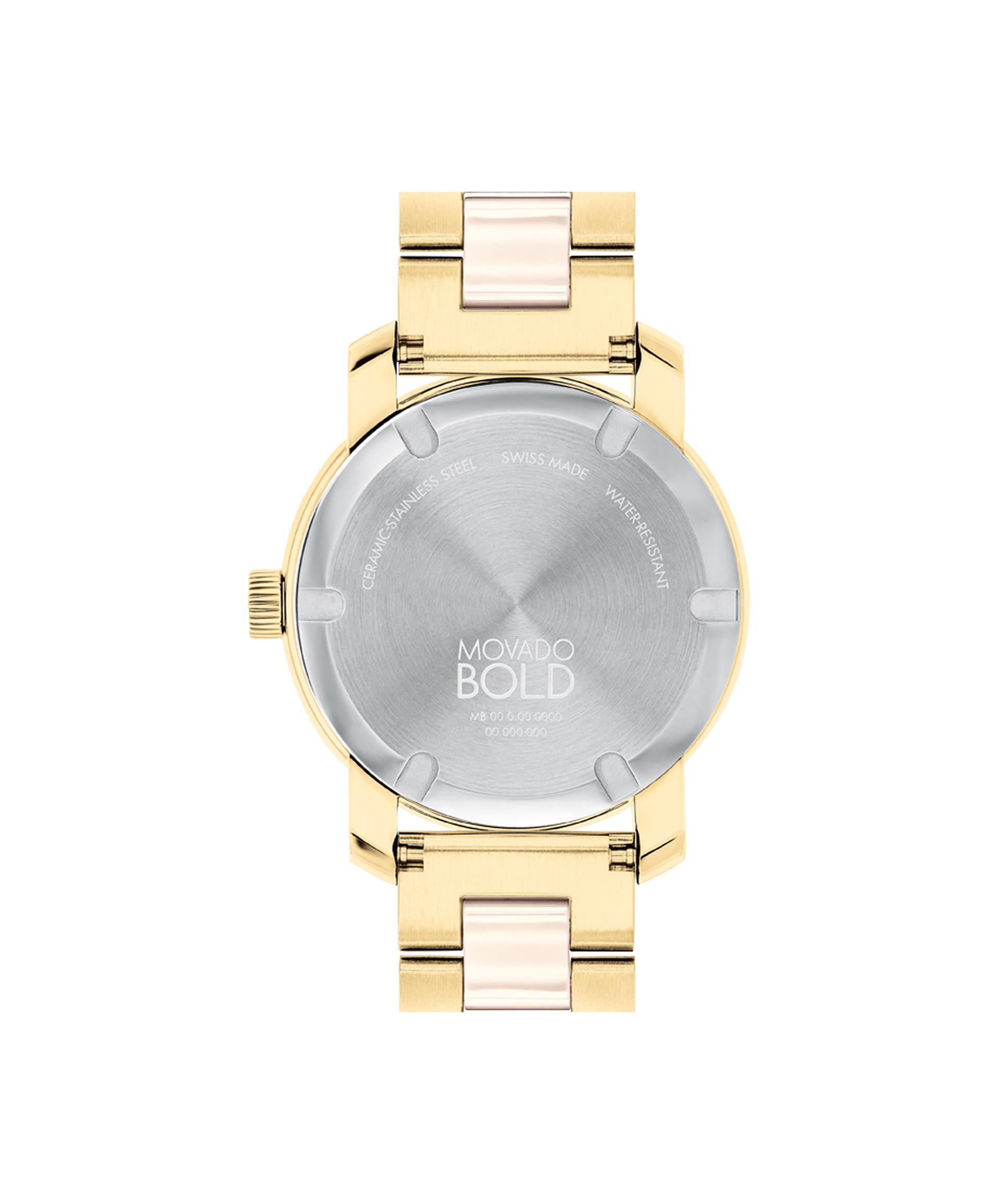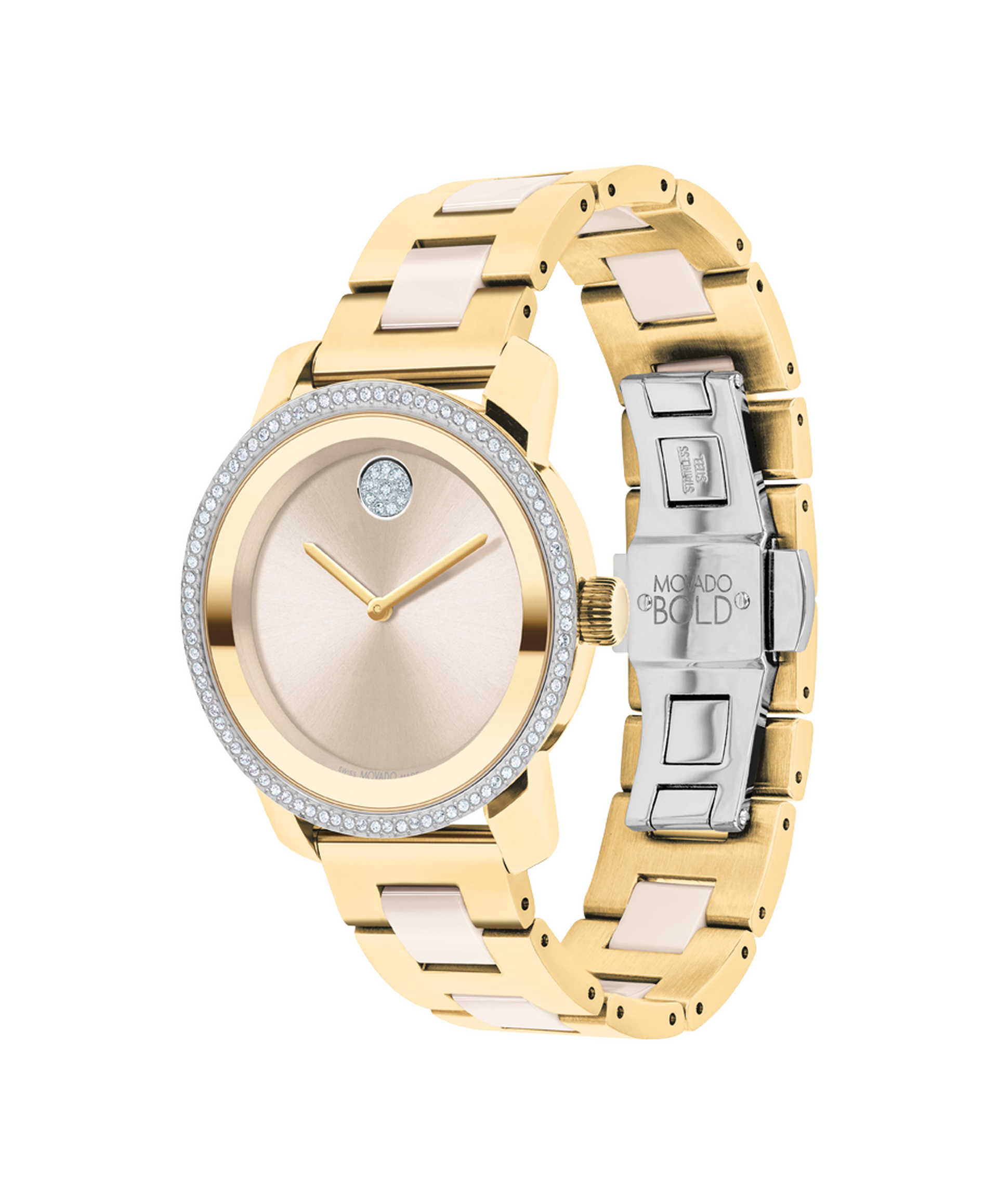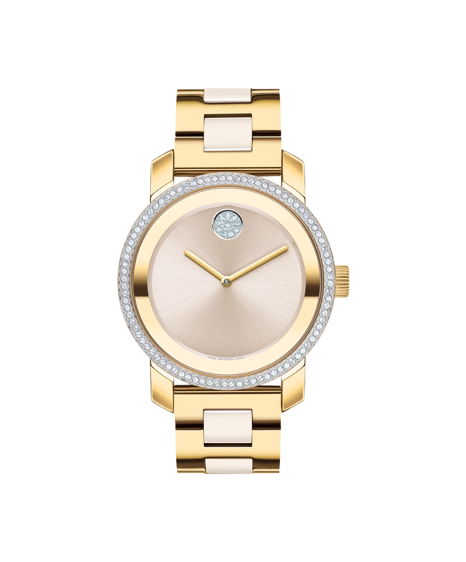 This cool, contemporary timepiece looks as good as it feels thanks to sleek ceramic accents. We’ve combined pale yellow gold tone ion-plated stainless steel with chic taupe ceramic center links and sparkling crystal details to create your new favorite watch.