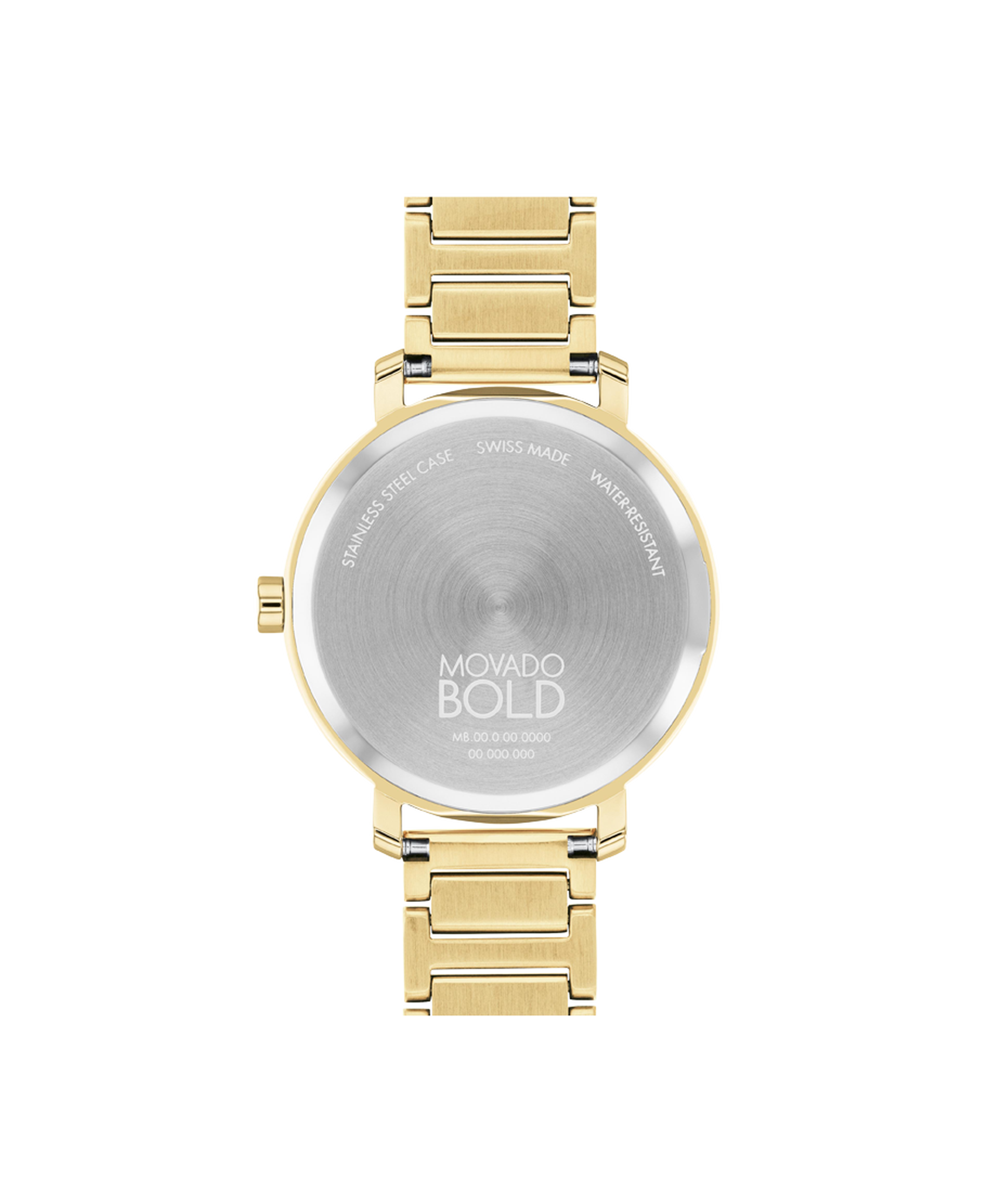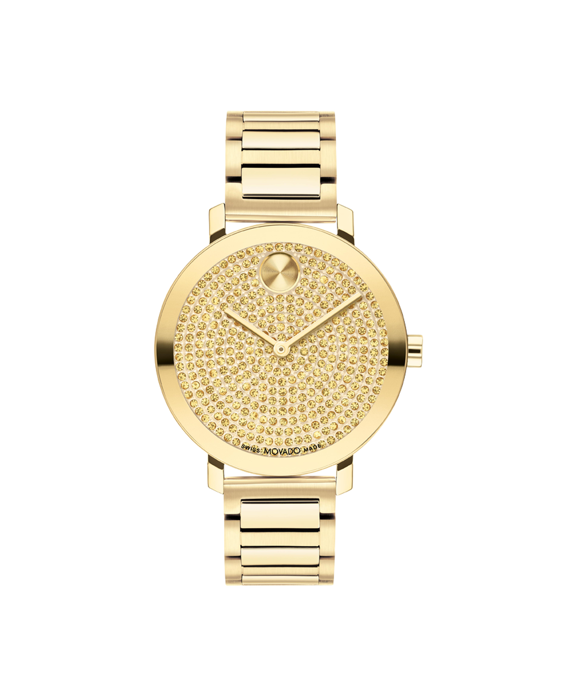 The evolution of modern design with a sharp look and elevated feel. Crafted from yellow gold-toned ion-plated stainless steel, this sleek timepiece features a statement-making 34mm case that houses a sparkling crystal pave dial, slim hands, and our iconic dot motif at 12 o’clock.