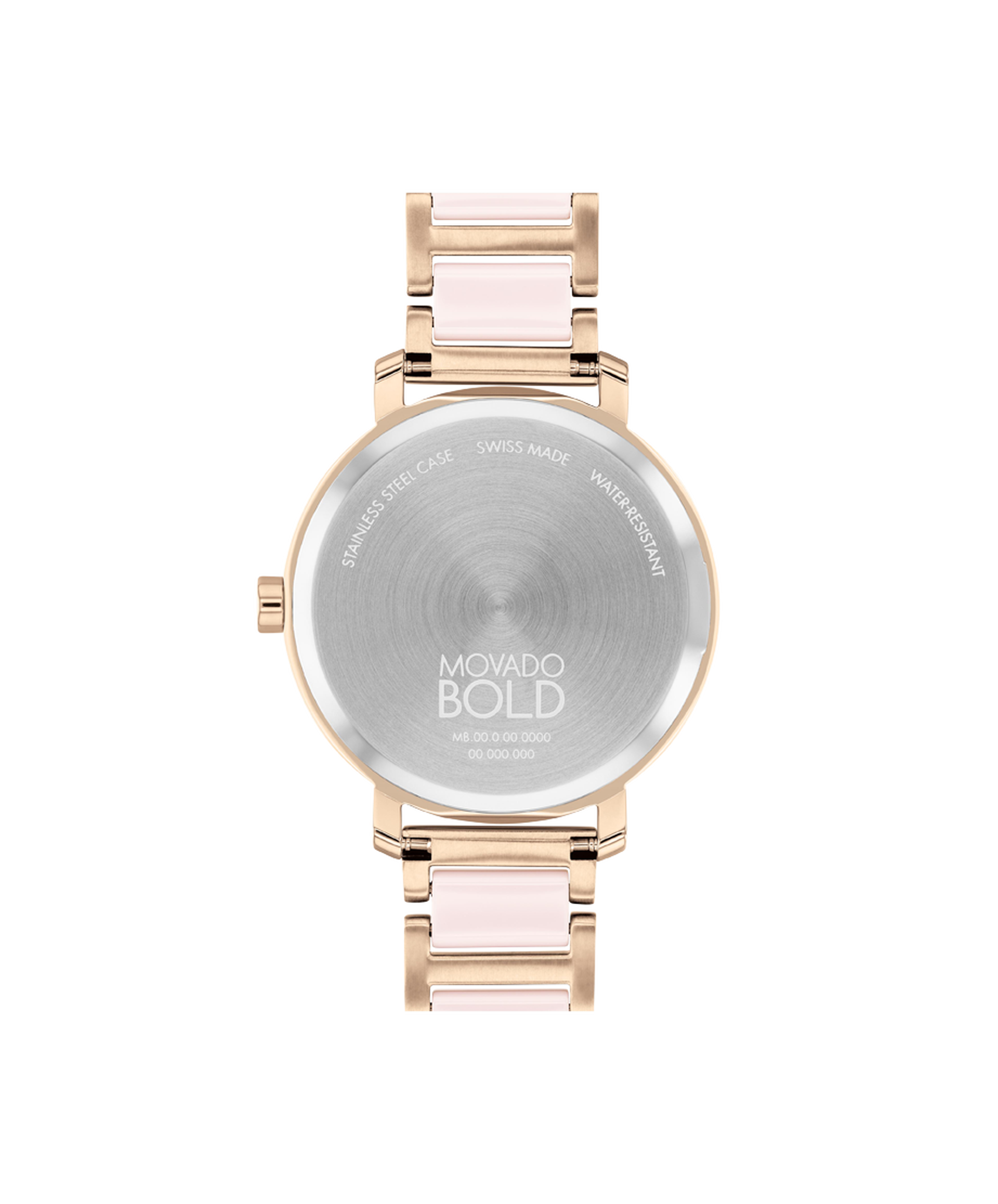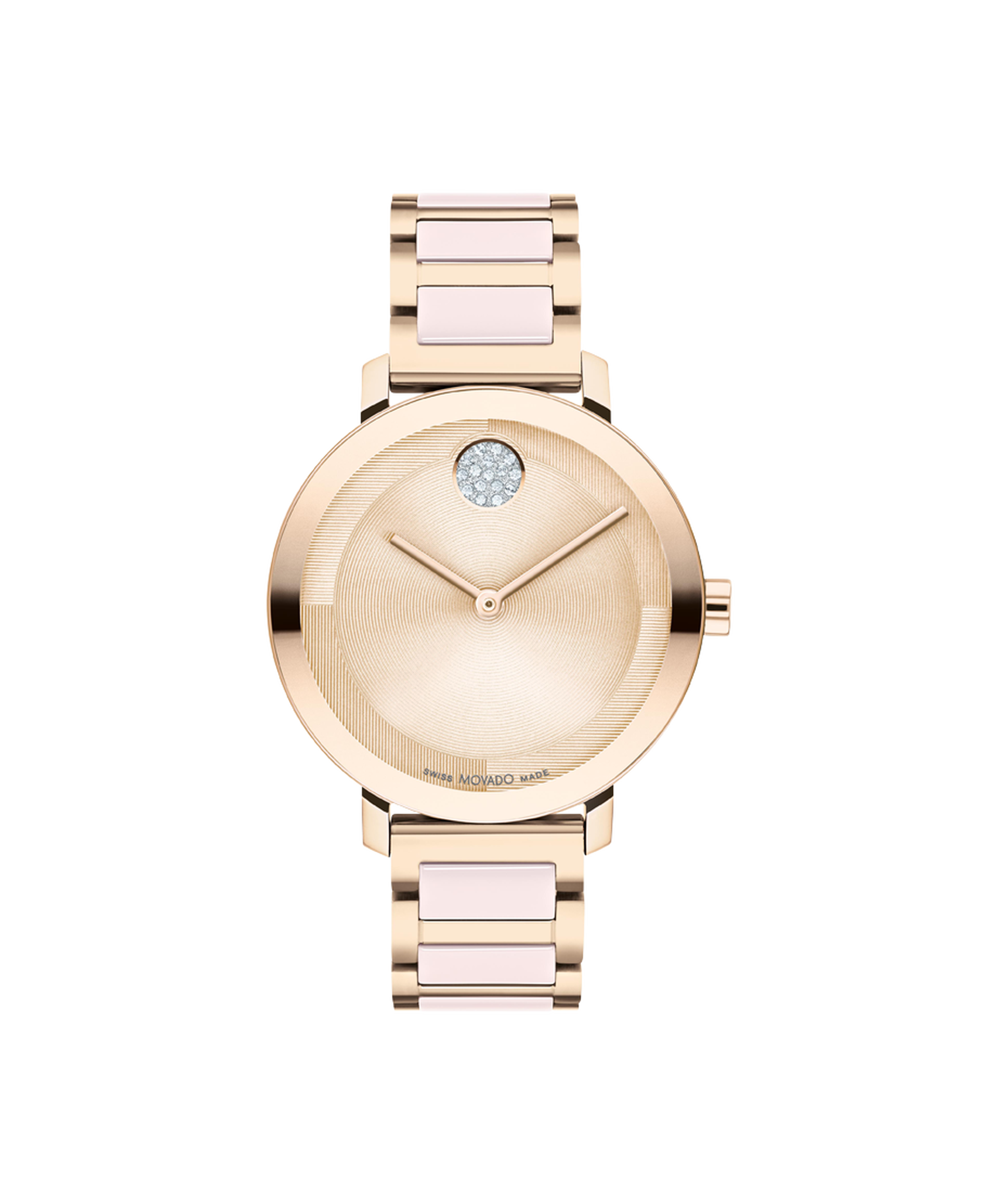 The evolution of modern design with a sharp look and elevated feel. Crafted from pale rose gold ion-plated stainless steel, this timepiece features a statement-making 34mm case that houses a matching micro-textured dial with slim hands and our iconic dot motif at 12 o’clock in sparkling crystals.