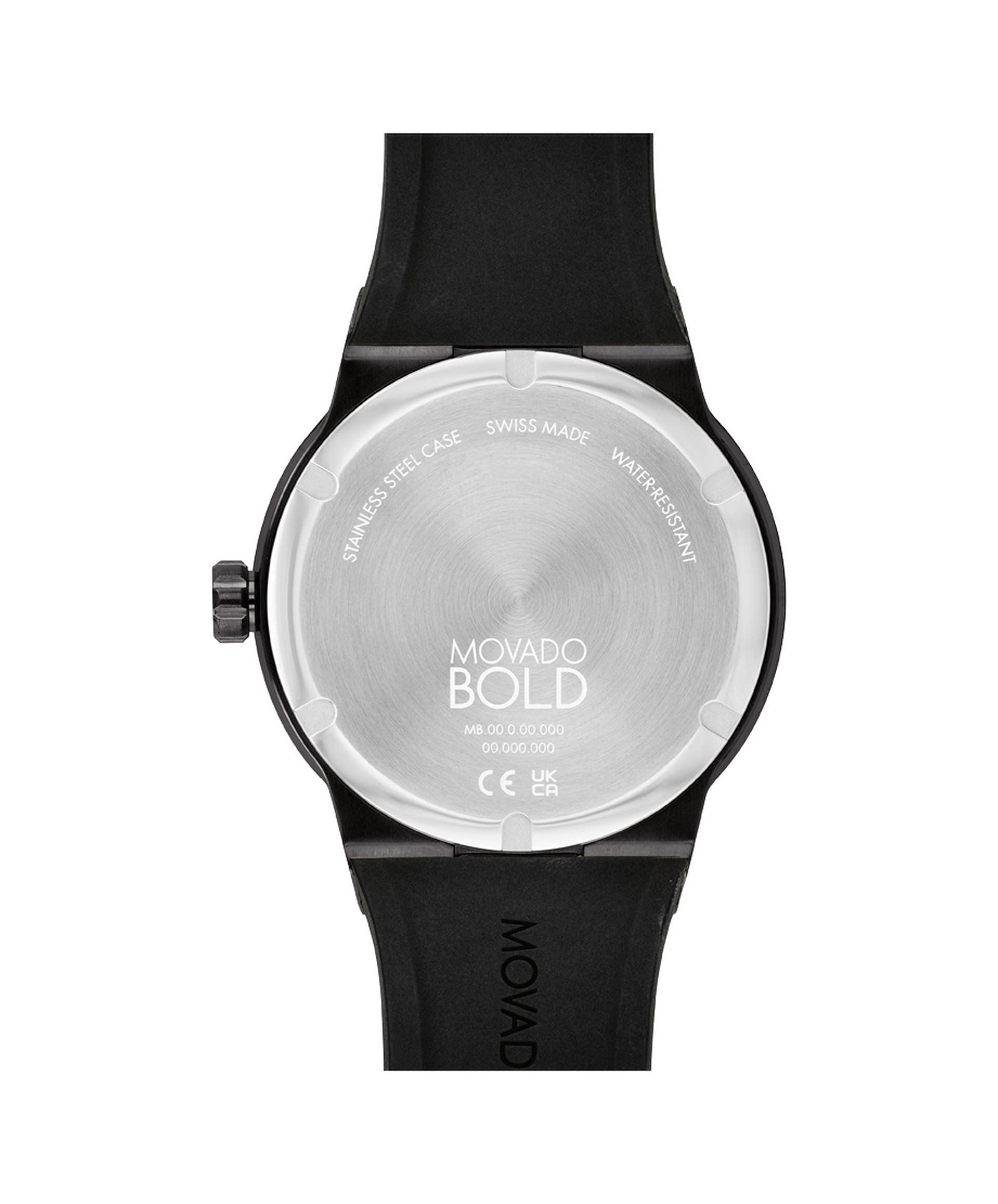 Movado BOLD Fusion, 42 mm black ion-plated stainless steel case & black ceramic bezel with a black-toned dial on black silicone strap.