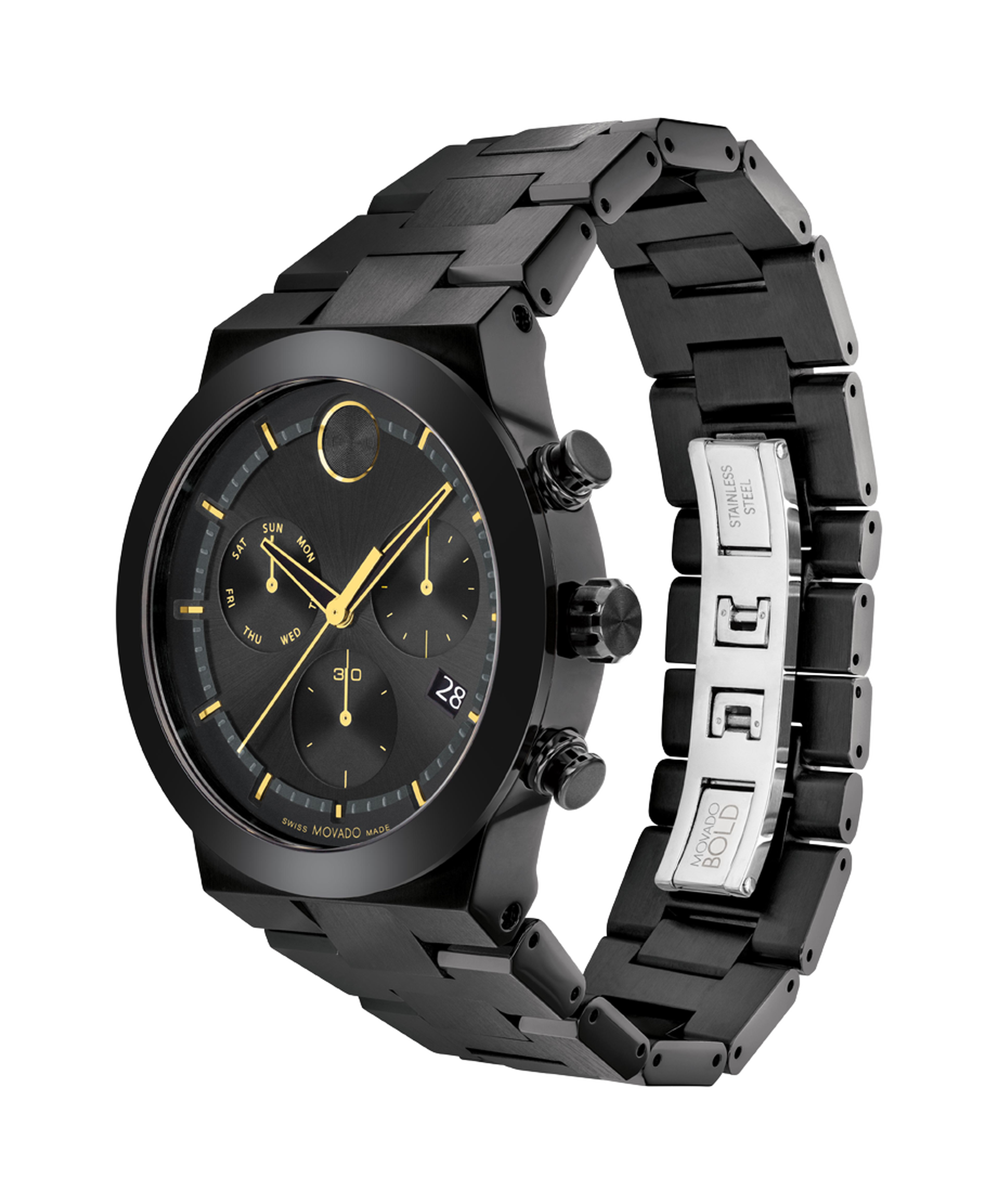 Movado BOLD Fusion, 44mm black ion-plated stainless steel case and bracelet with a black and pale yellow gold accented chronograph dial, ceramic bezel, and date window detailing.