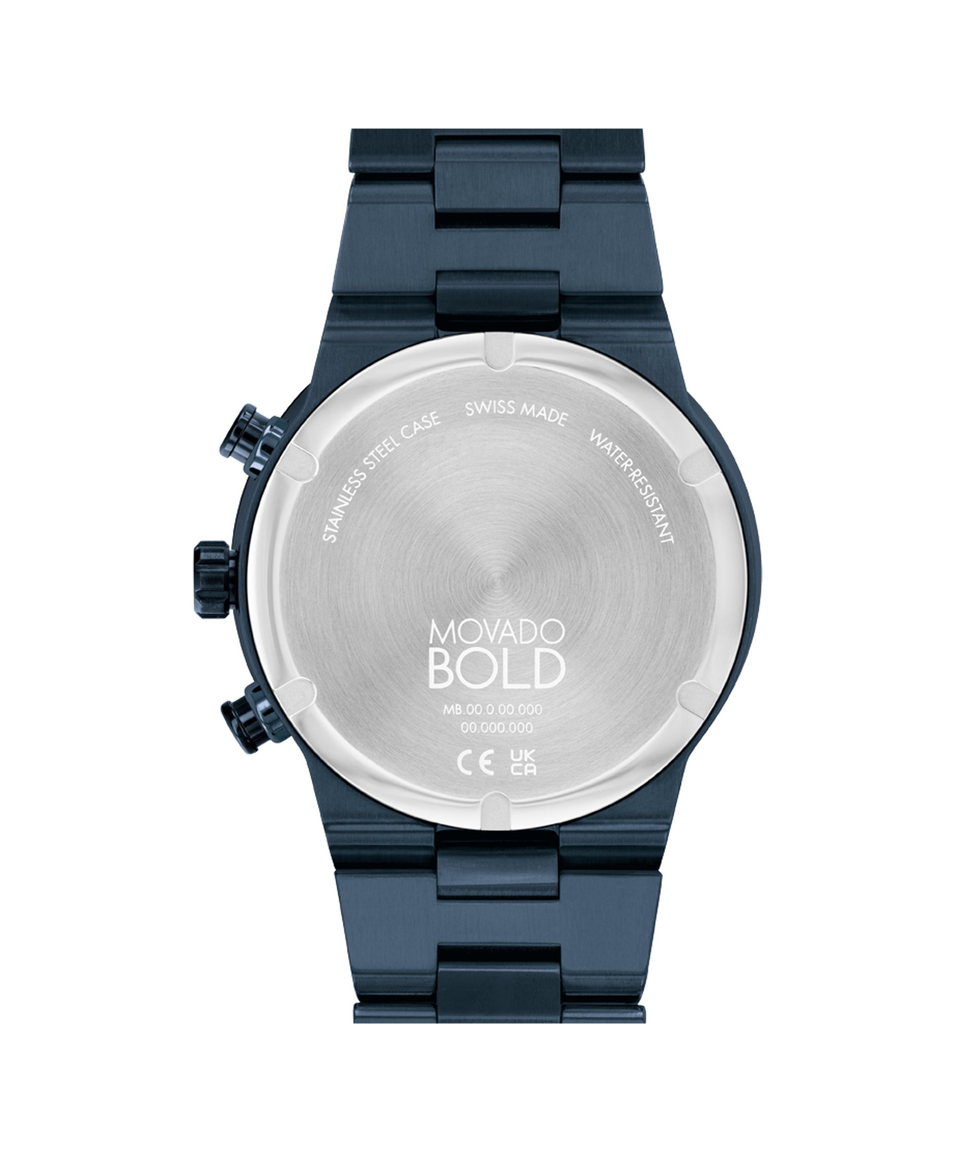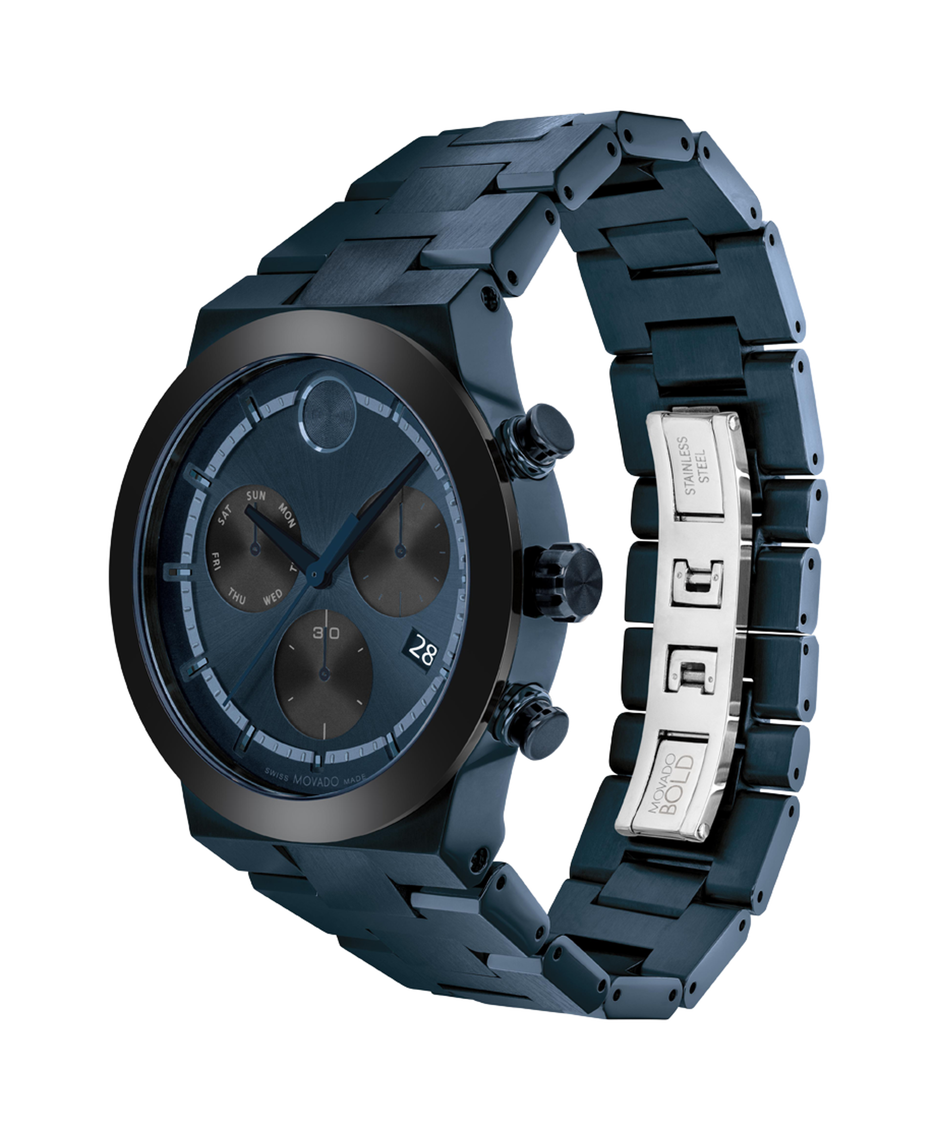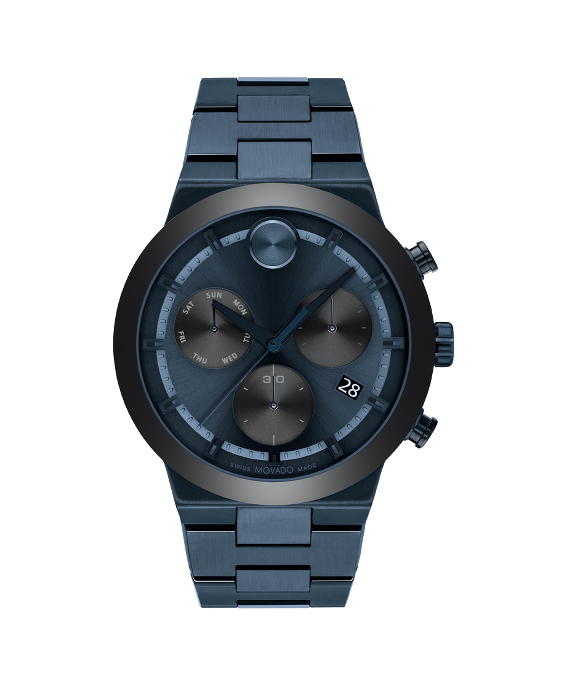 Movado BOLD Fusion, 44mm blue ion-plated stainless steel case and bracelet with a blue and black accented chronograph dial, ceramic bezel and date window detailing.