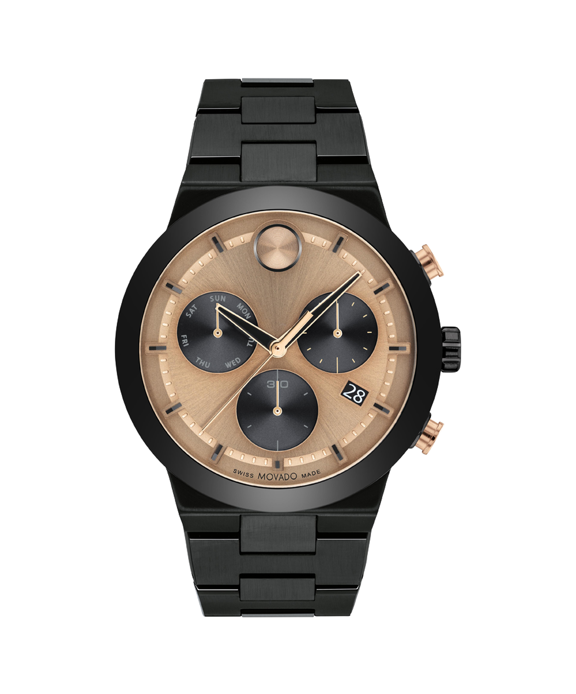 Sporty style with contemporary-cool edge. This BOLD Fusion chronograph features a black ion-plated stainless steel 44mm case and a matching link bracelet for a sleek, minimalist effect. Its bronze toned dial is framed by a black ceramic bezel and boasts our iconic dot motif at 12:00, a date window, three sub dials and a minute track, all accented in rich black.