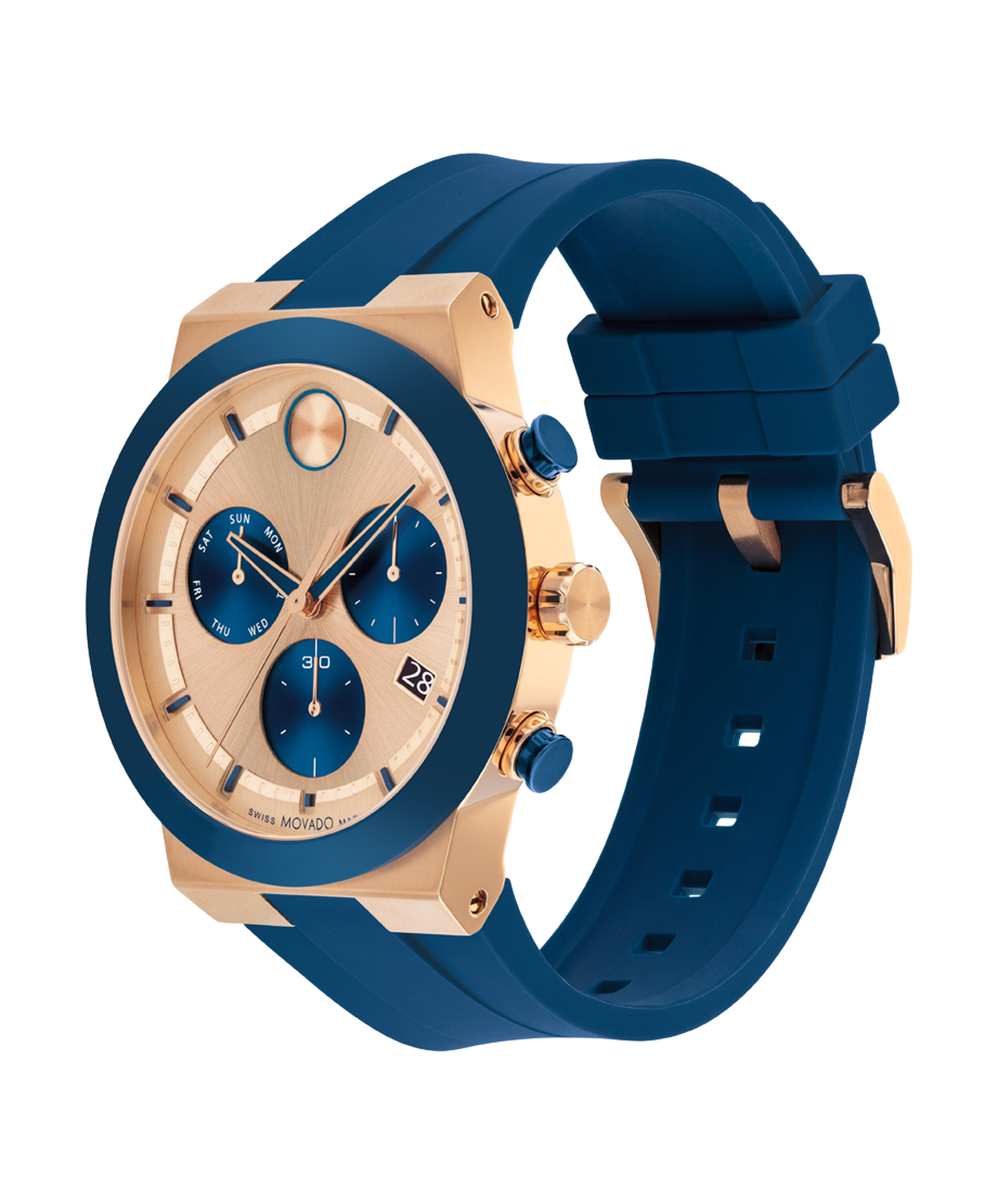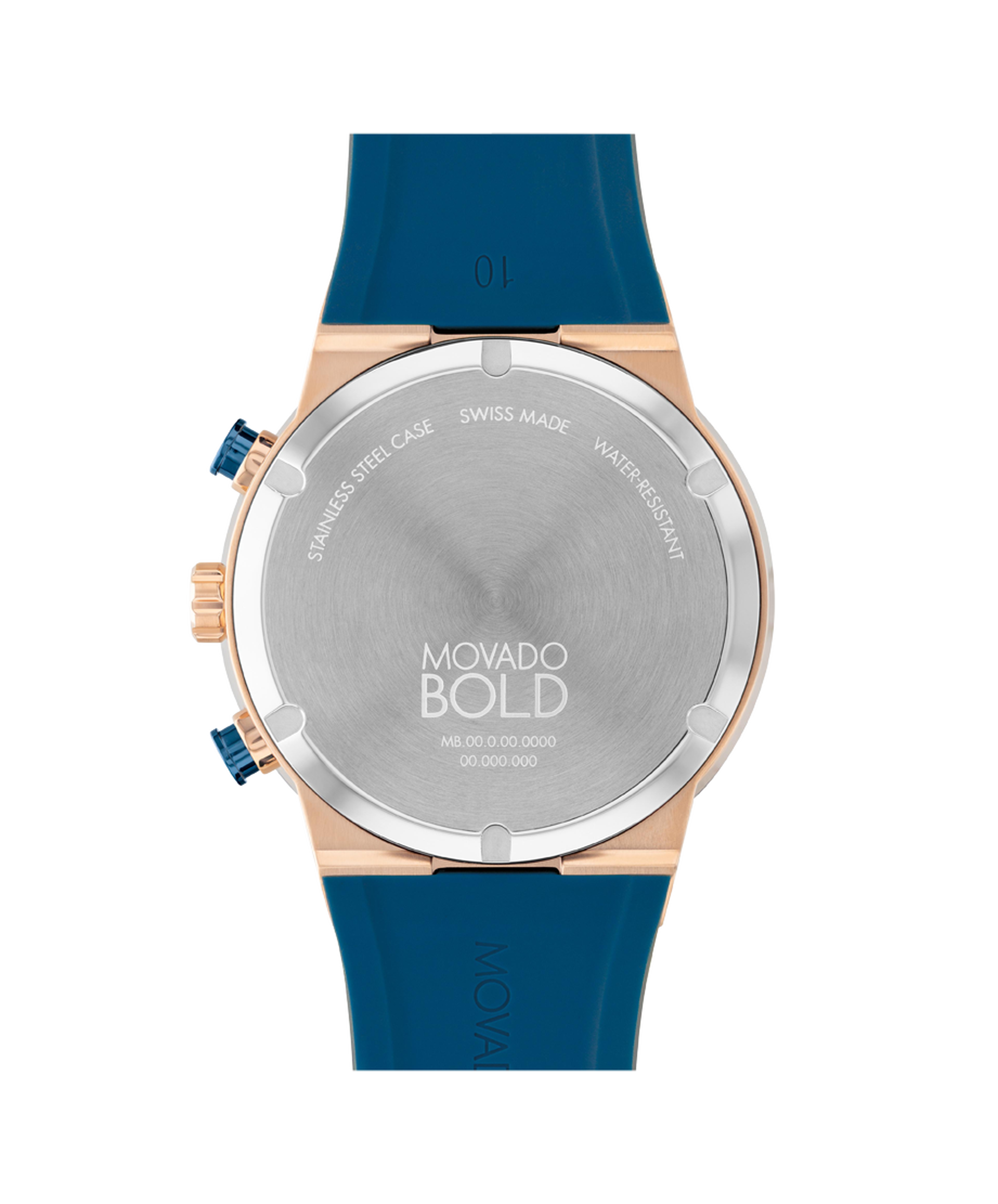 Sporty style with contemporary-cool edge. This BOLD Fusion chronograph features a super sleek navy silicone strap for an undeniably modern feel. This minimalist design features a 44.5mm case crafted from rose goldtone ion-plated stainless steel with a navy ceramic bezel.