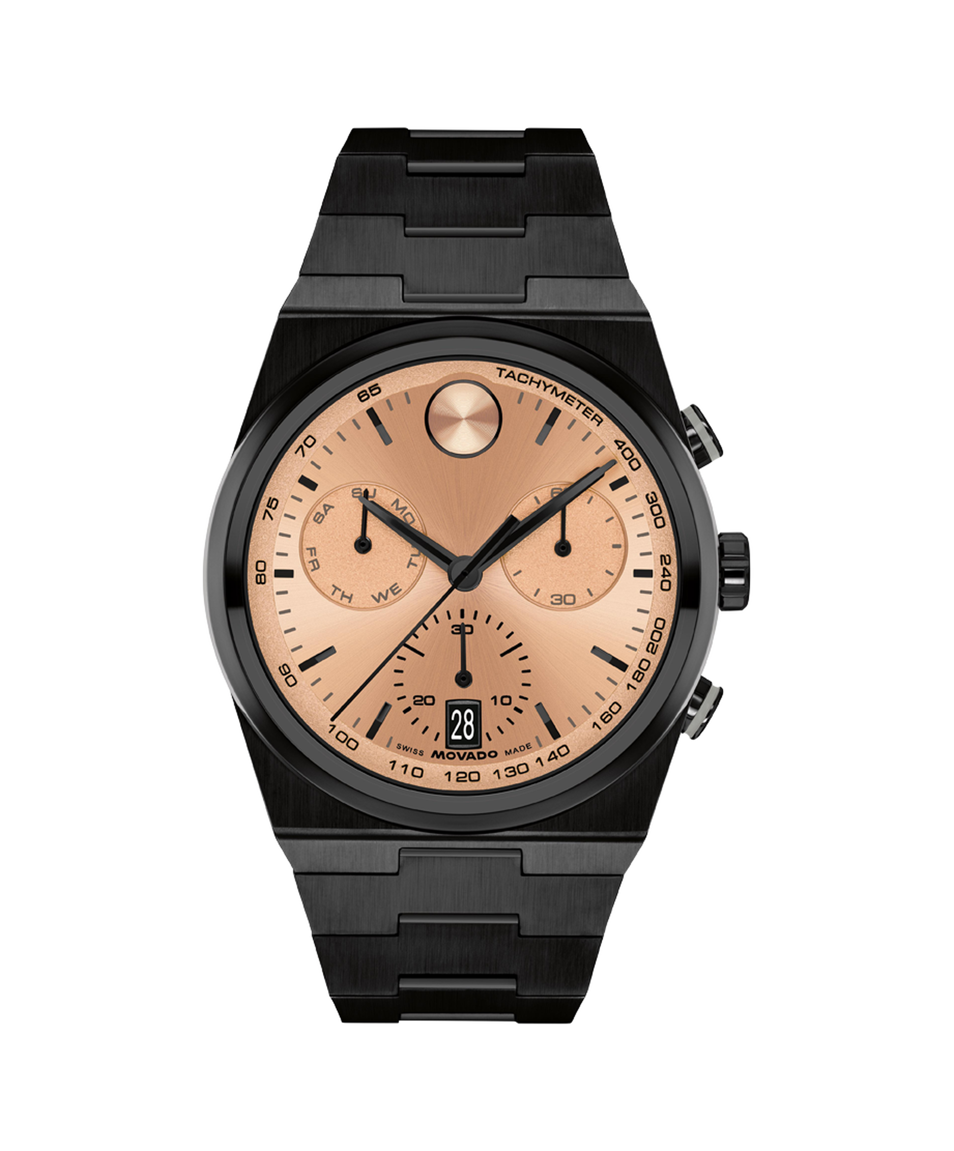 The BOLD Quest Chronograph looks to the future with a shaped case and an integrated bracelet. This 42mm chronograph features a rose gold-tone dial with satin-finish subdials, black hands, and our signature dot at 12 o'clock.