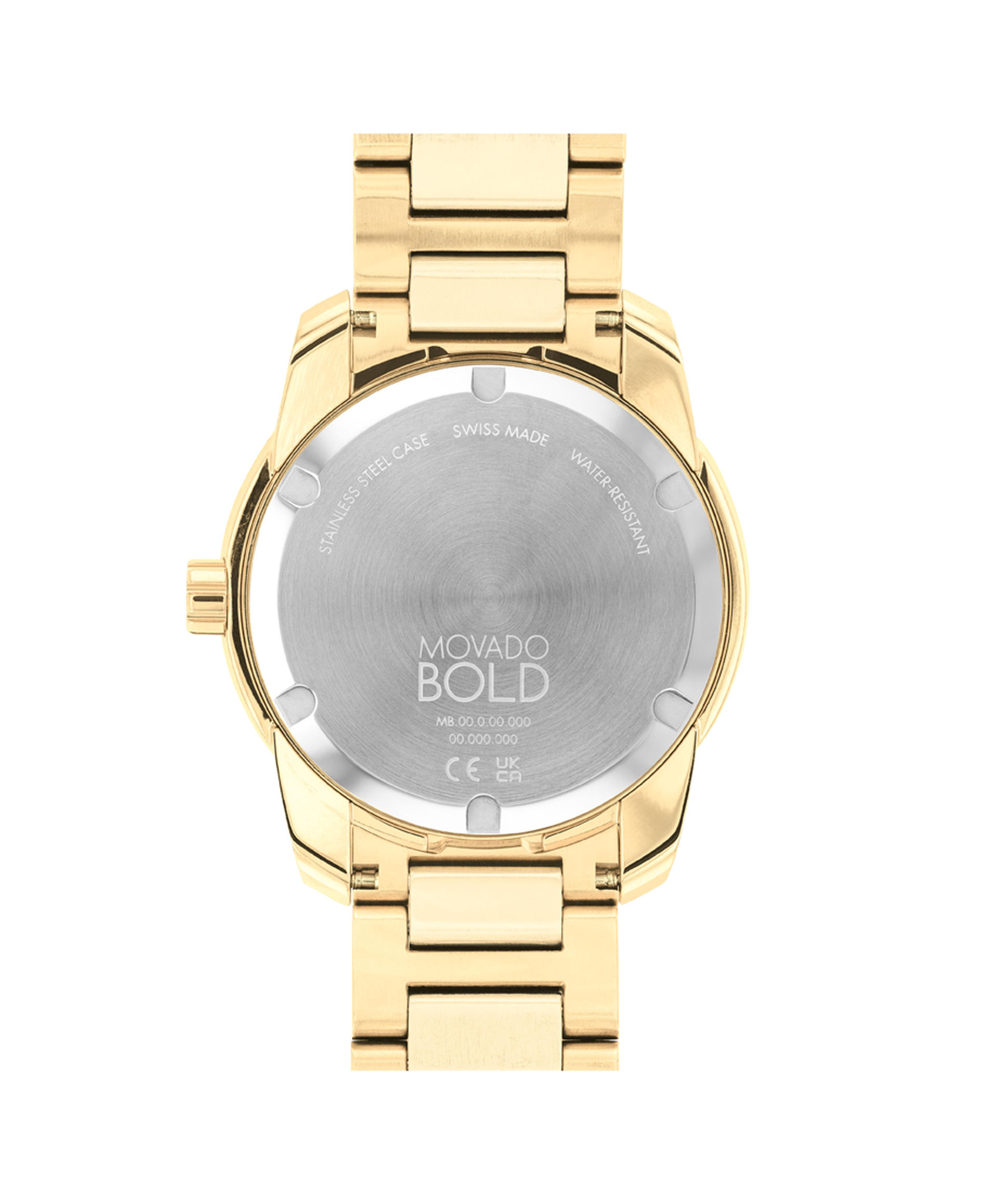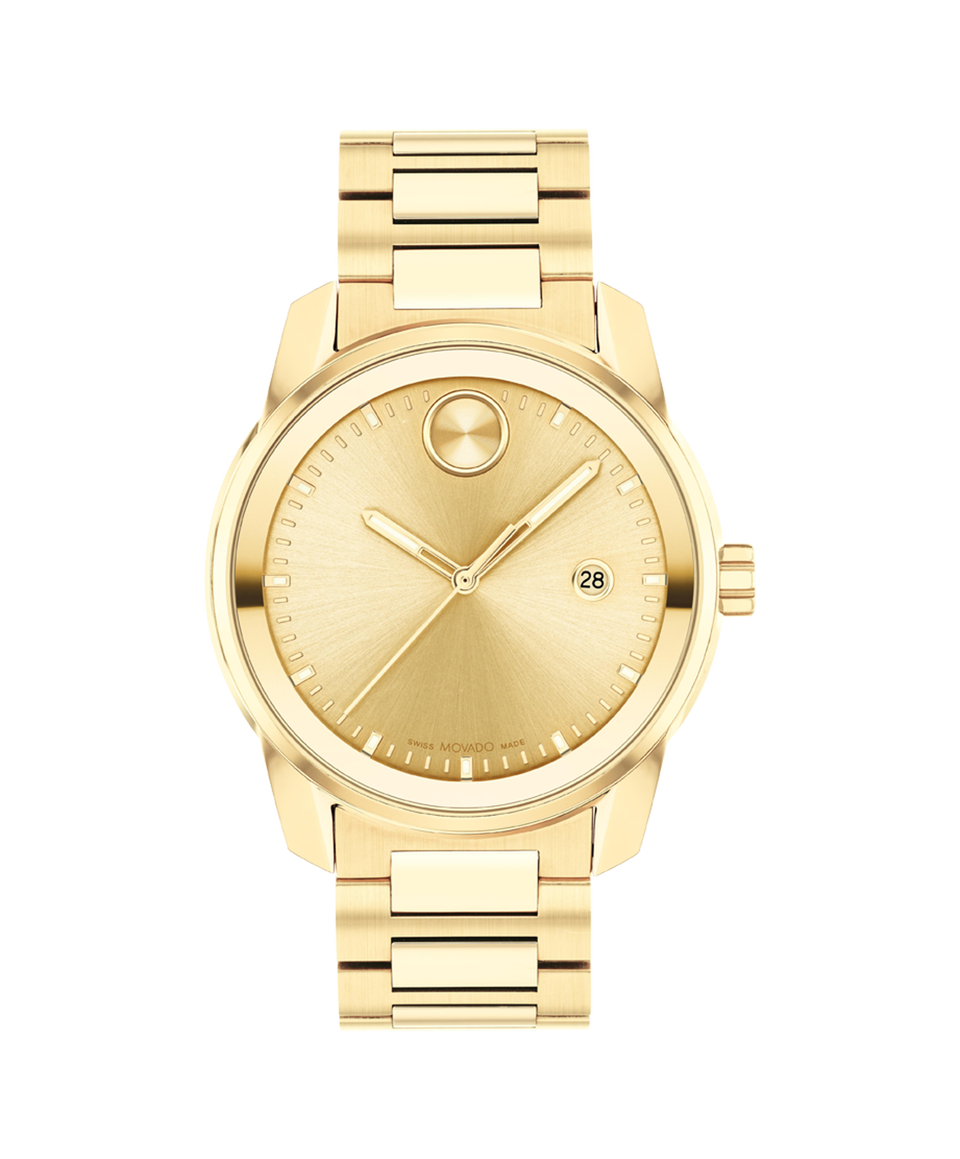 Movado BOLD Verso, 42 mm yellow gold ion-plated stainless steel case and bracelet with yellow gold metallization. Features a yellow gold-toned dial, Swiss Super-LumiNova® accents, and date window detailing.