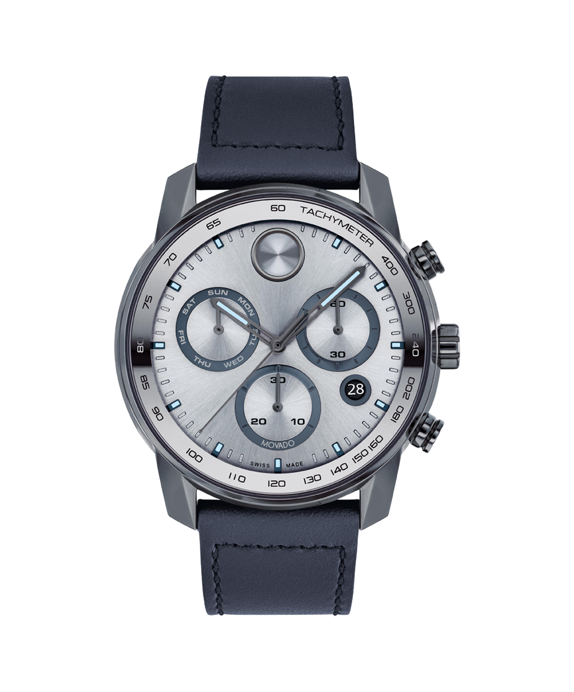 The sporty, eternally chic chronograph gets fresh feel with striking contemporary design that combines modern minimalism and a bold edge. The luxurious navy leather strap is paired with a statement-making 44mm case crafted from military grey ion-plated stainless steel for an ultra-modern vibe.