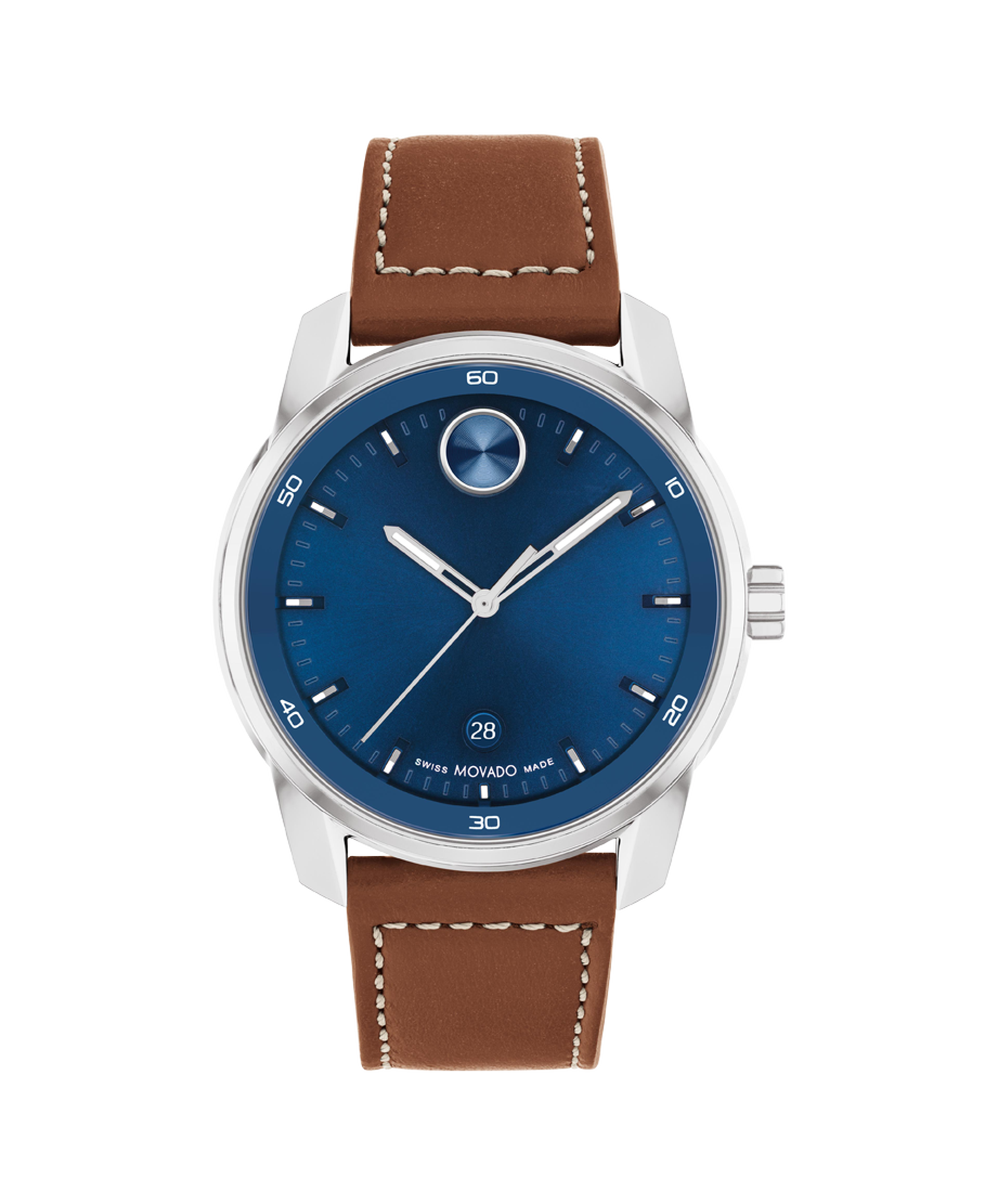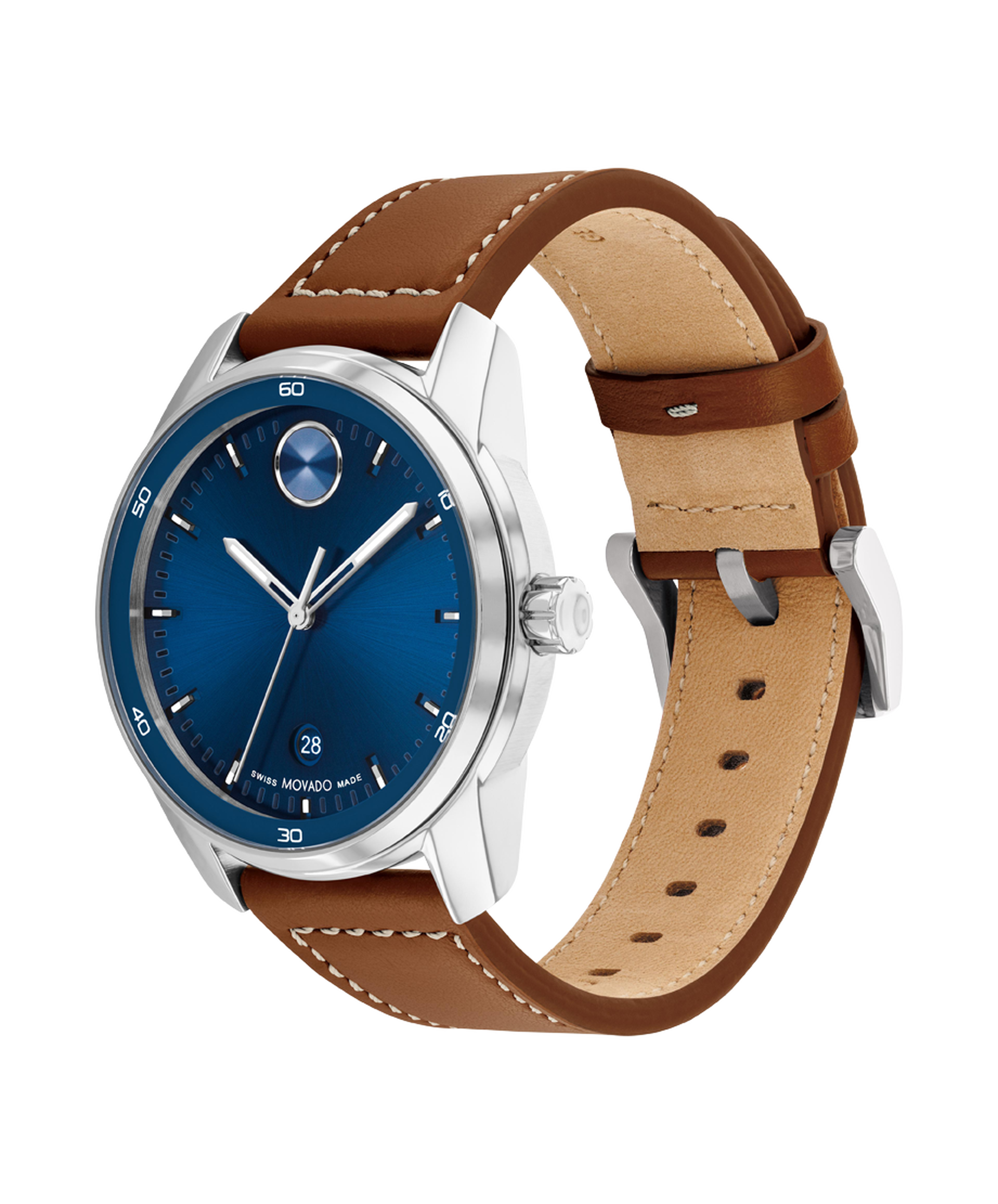 We’re reimaging the sport watch with strong, contemporary design that combines modern minimalism with a bold edge. This statement-making 42mm stainless steel case is paired with a luxe cognac leather strap. The ultra-cool blue dial features our iconic dot motif at 12:00, a date window, and Swiss Super-LumiNova® accents.