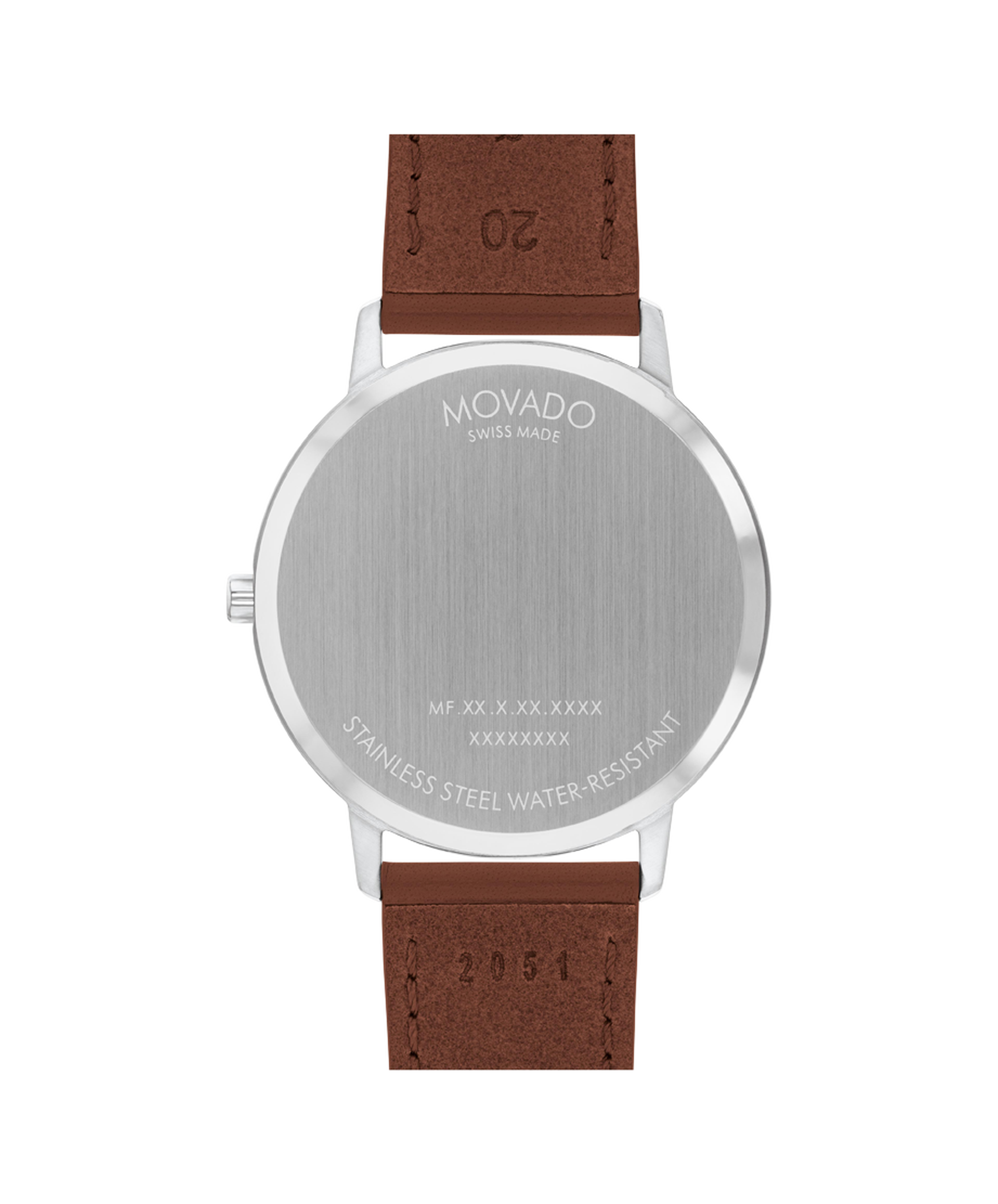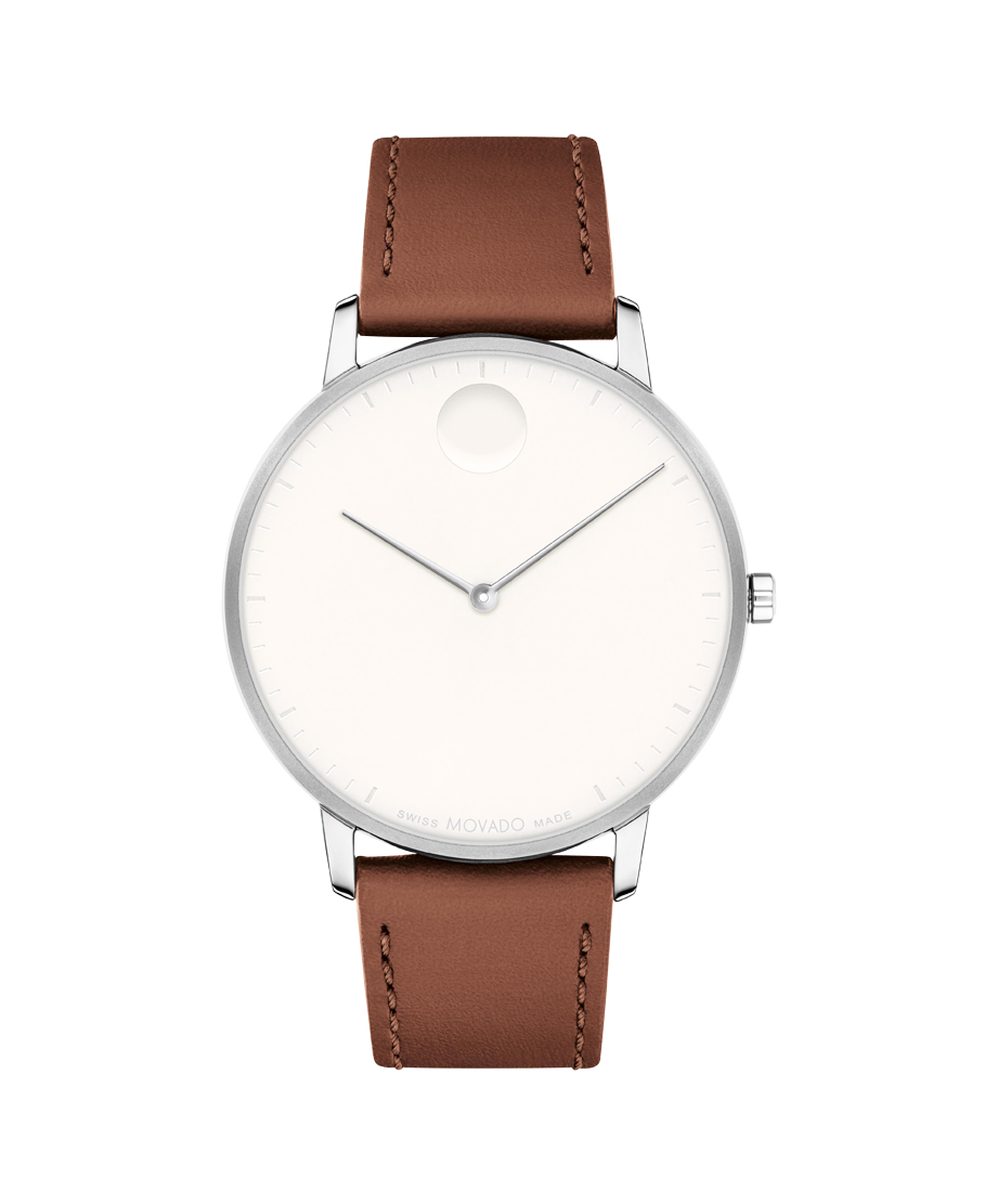 Movado Face, 41mm stainless steel case, white dial, stainless steel hands on a cognac leather strap.