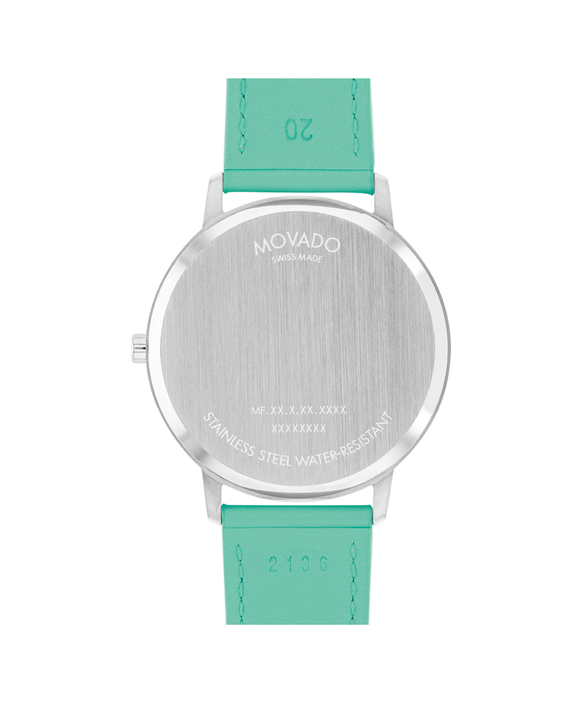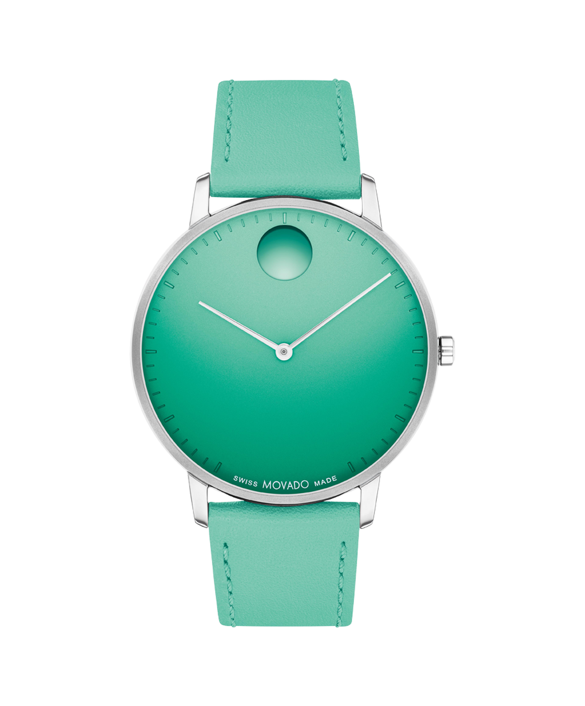 The Face Collection explores minimalism through the art of color and tonality. This 41mm two-hand watch features a teal ombre dial, slim steel hands, teal leather strap, and our oversized recessed dot at 12 o'clock.