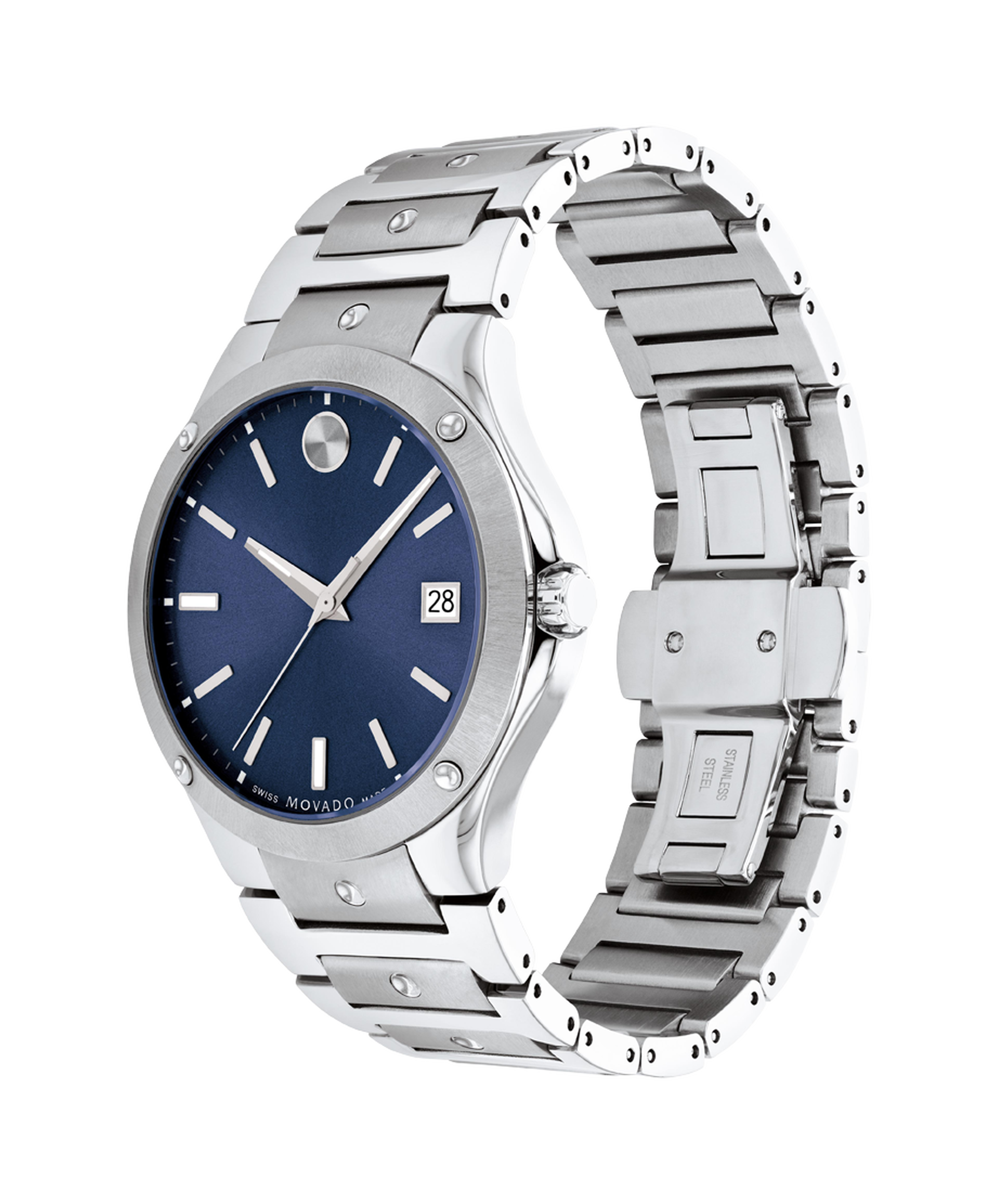 Movado S.E., 41mm dual finished stainless steel case and bracelet with silver concave polished dot accents and blue sunray dial. Features Sapphire crystal, date window detailing, and Swiss Super-LumiNova® hands, hour markers & indices at 6:00 and 9:00.