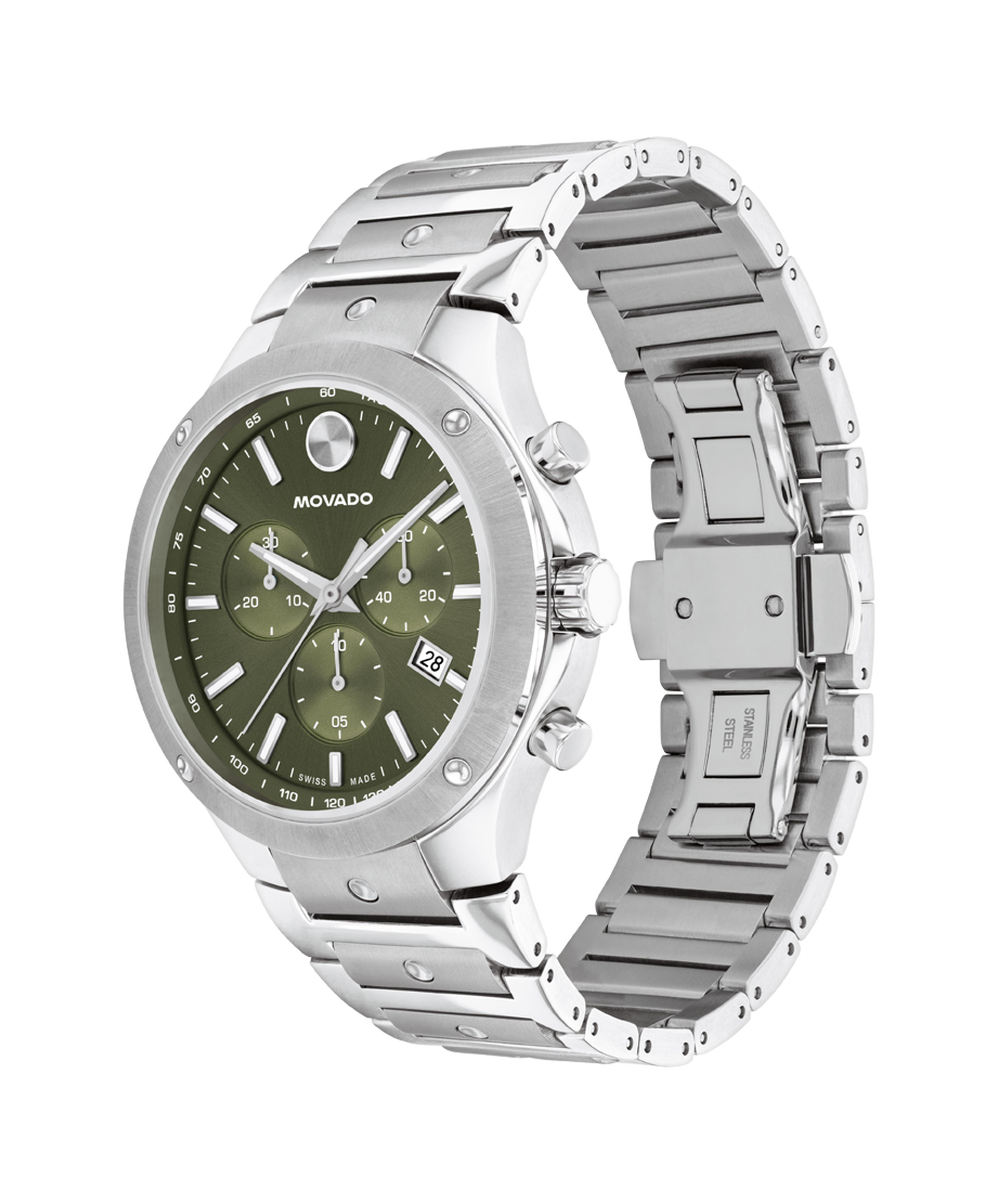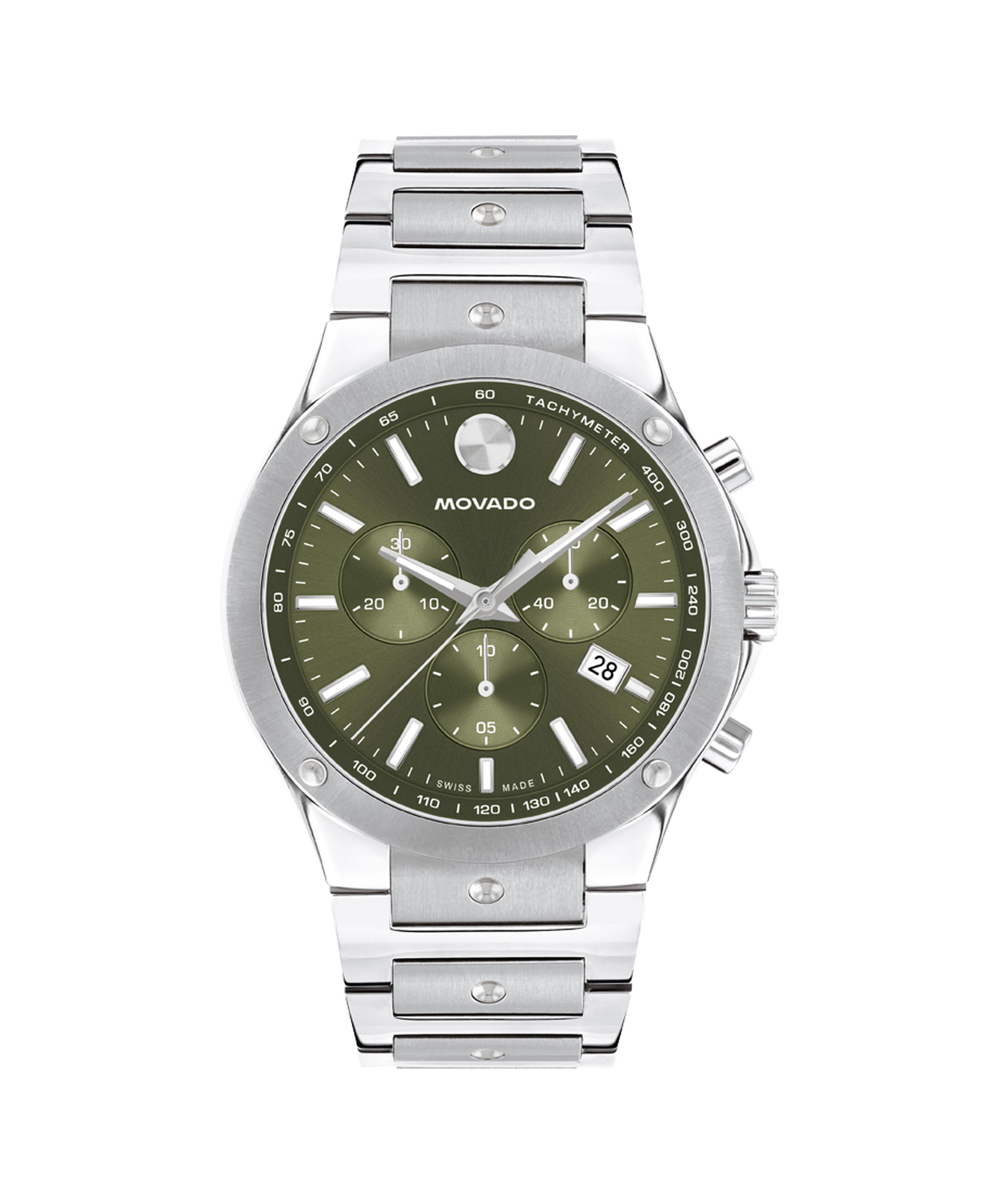 The Movado SE is defined by Swiss craftsmanship and sport-elegant design. This 42mm chronograph watch features a green sunray dial, Swiss Super-LumiNova accents, and our signature dot motif.