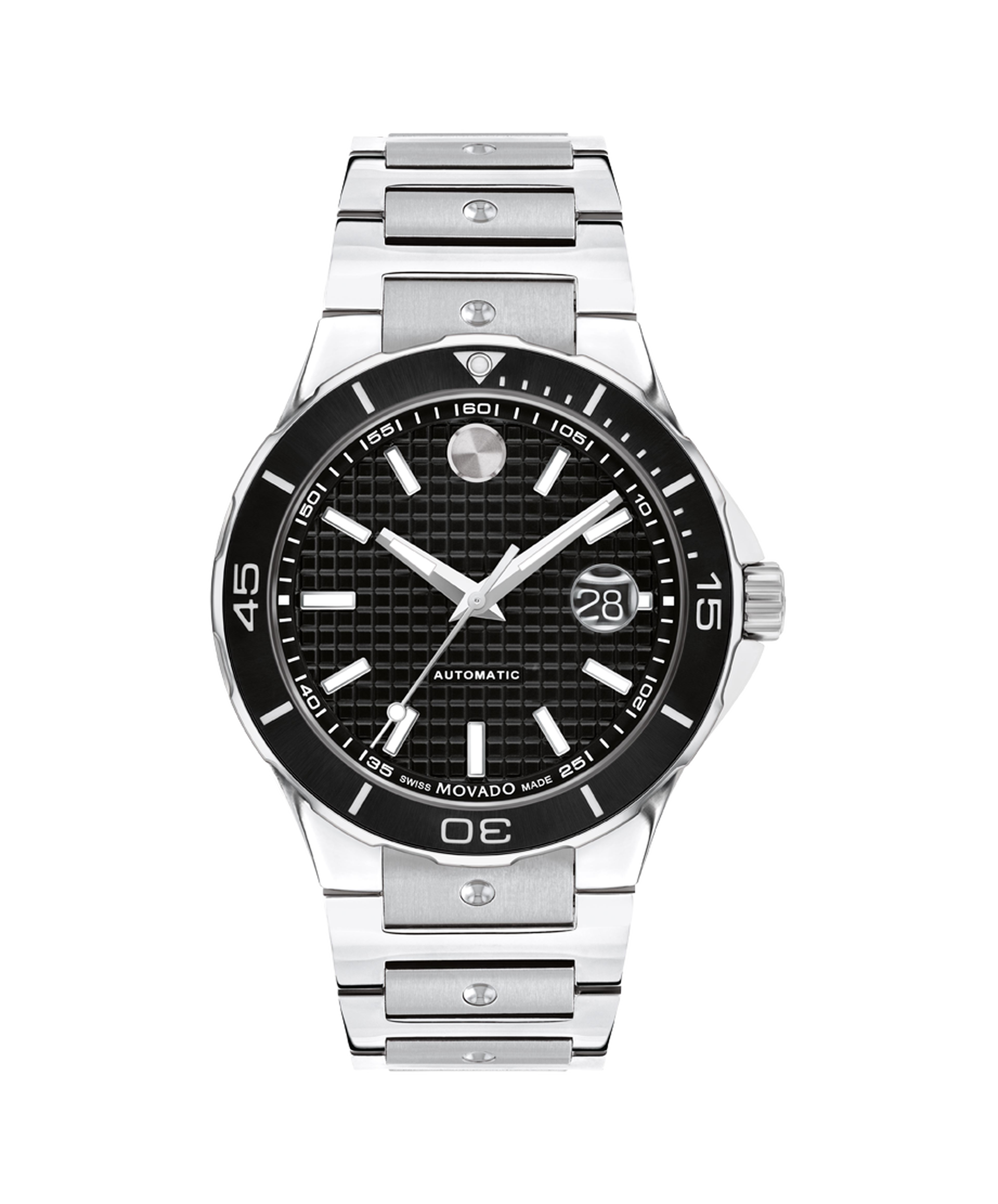A classic dive style takes futuristic form in the Movado SE, an evolution of our original Sports Edition design circa 2000. A Swiss made self-winding movement drives this watch, powered by the motion of your wrist. This 43 mm watch features a black textured dial, dive-inspired ceramic bezel, and an exhibition caseback.