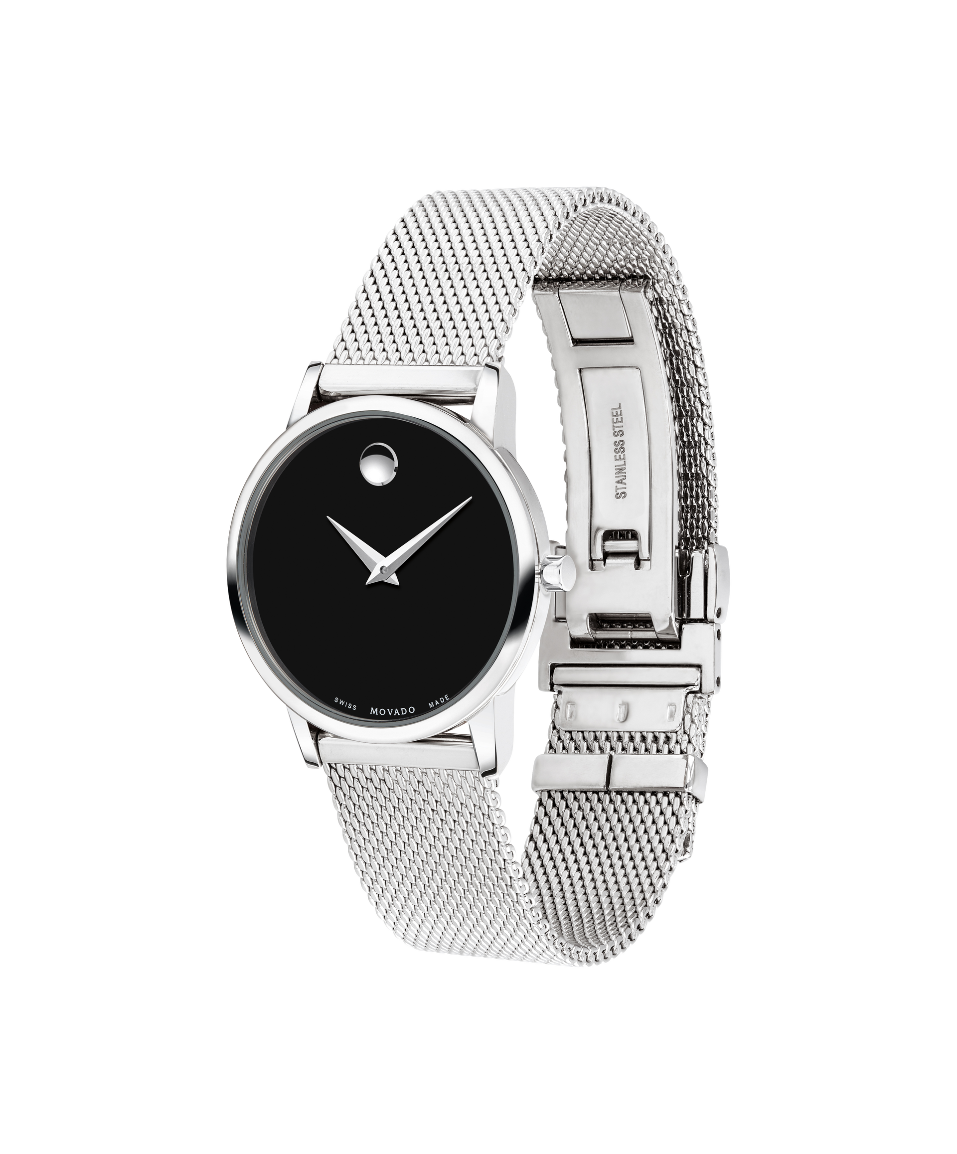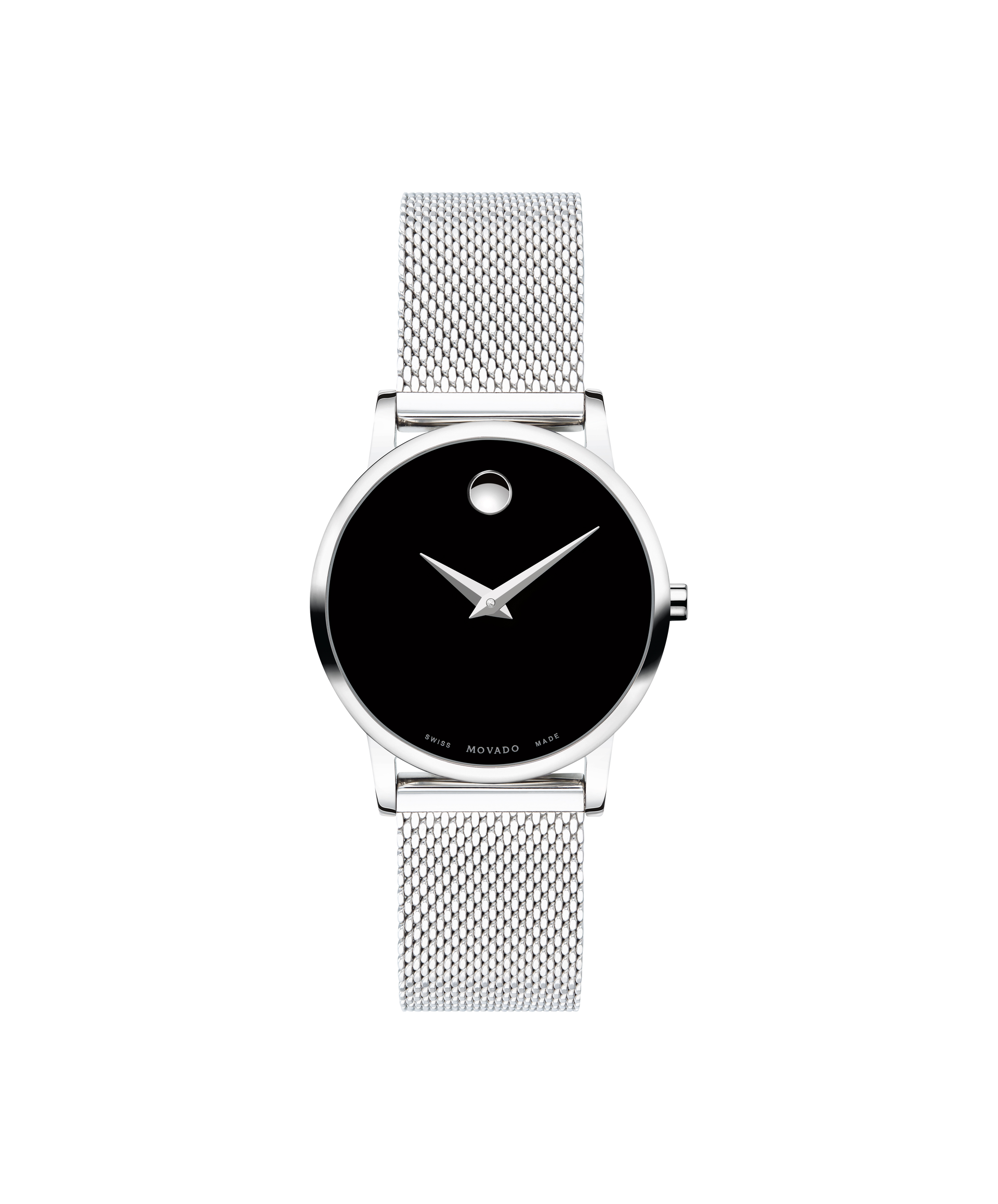 Women's Museum Classic watch, 28 mm stainless steel case, black Museum dial and silver-toned dot and hands, stainless steel mesh bracelet with sliding closure clasp.