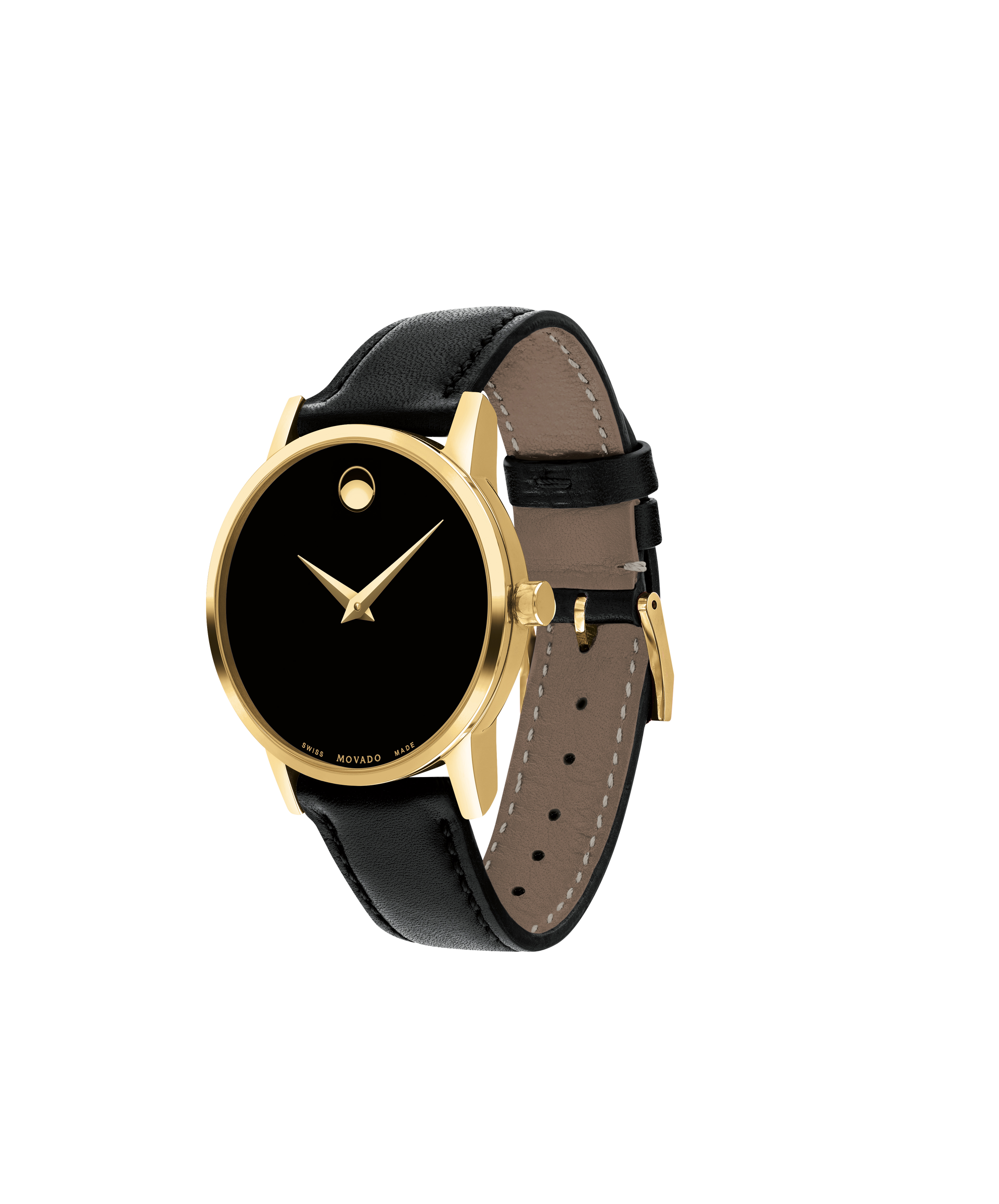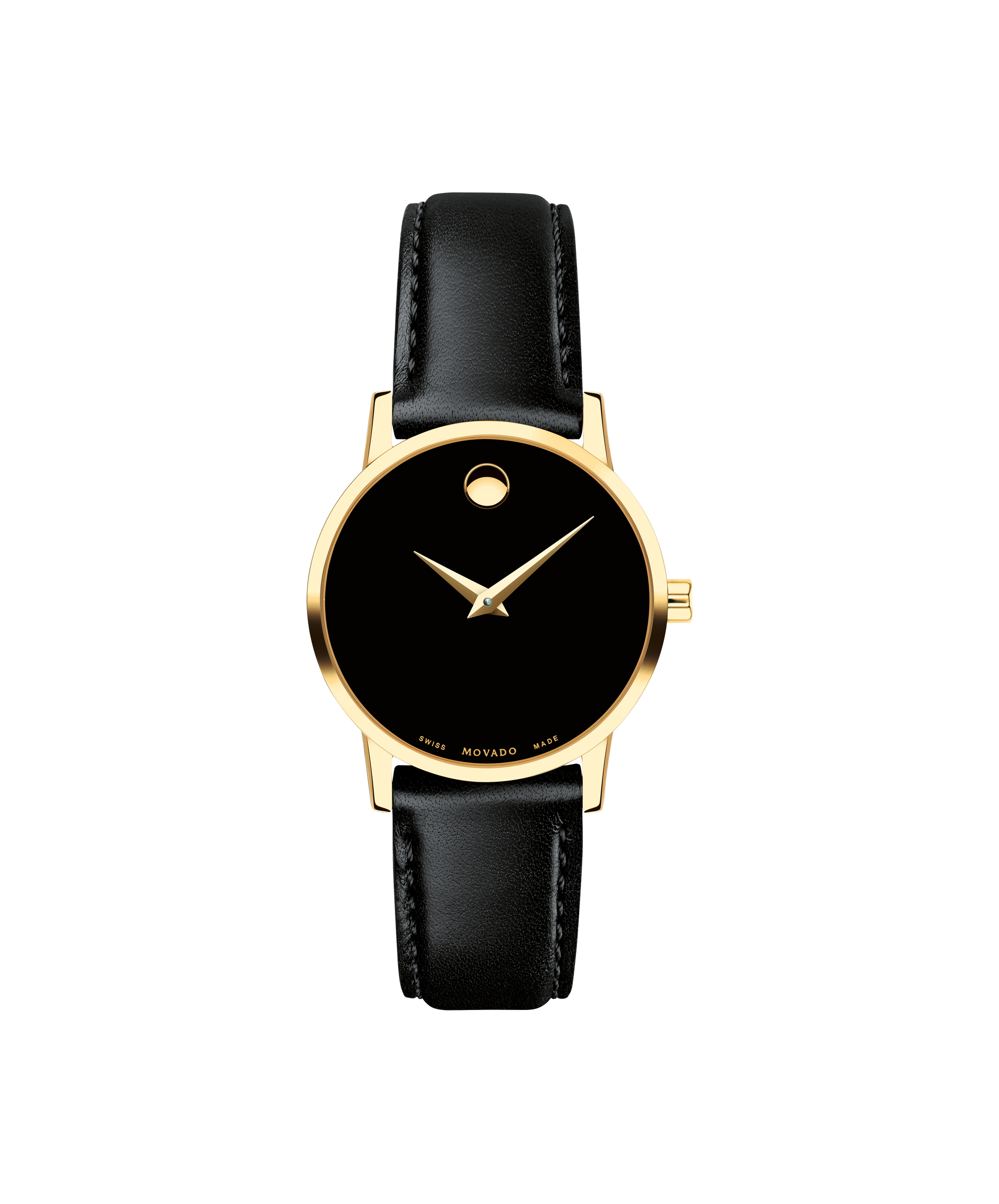 Women's Museum Classic watch, 28 mm yellow gold PVD-finished stainless steel case, black Museum dial with yellow gold-toned dot and hands, smooth black calfskin strap with yellow gold PVD-finished stainless steel buckle.