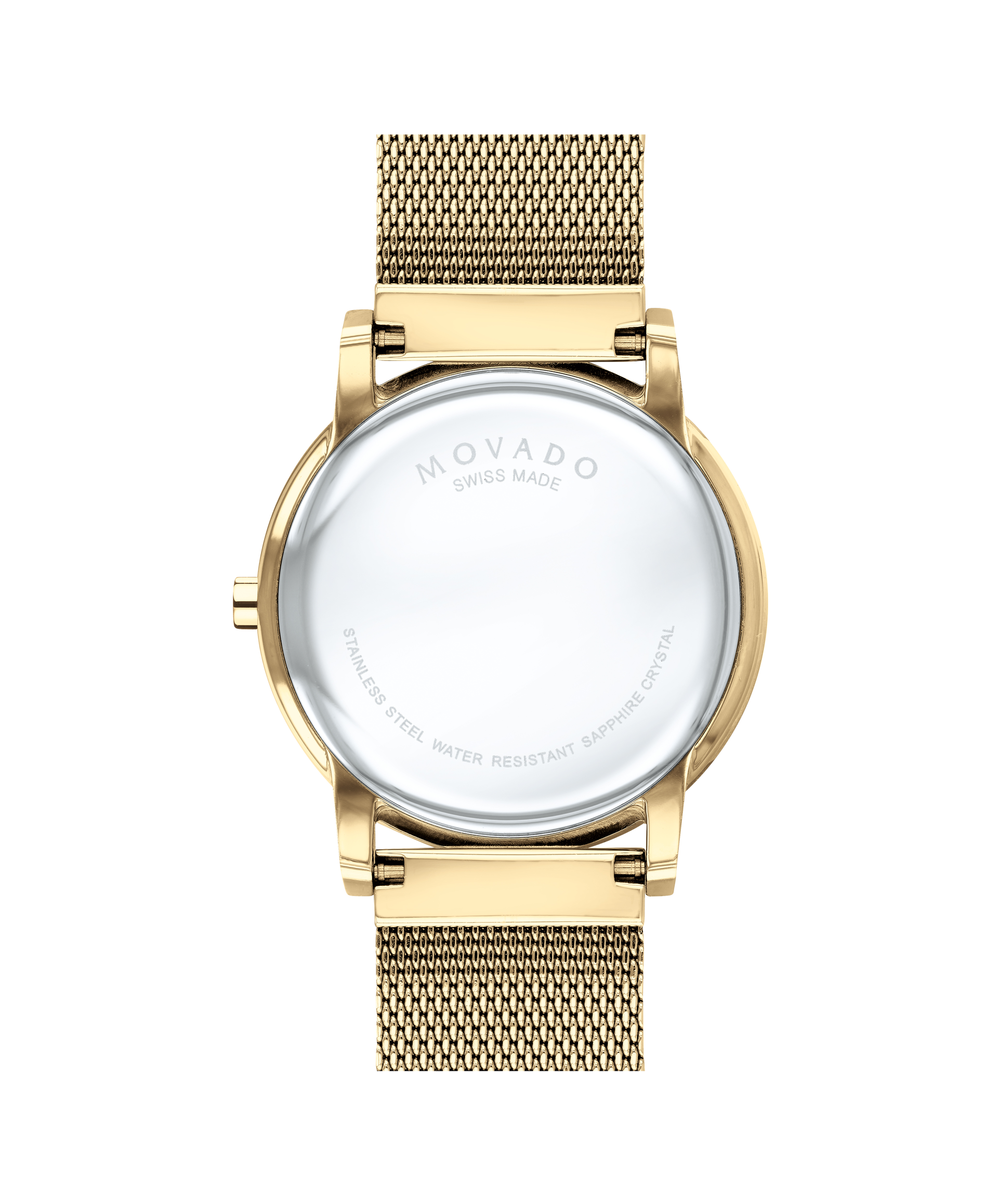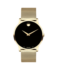 Movado Museum Classic, 40mm yellow gold PVD-finished stainless steel case and mesh bracelet with a black-toned dial.