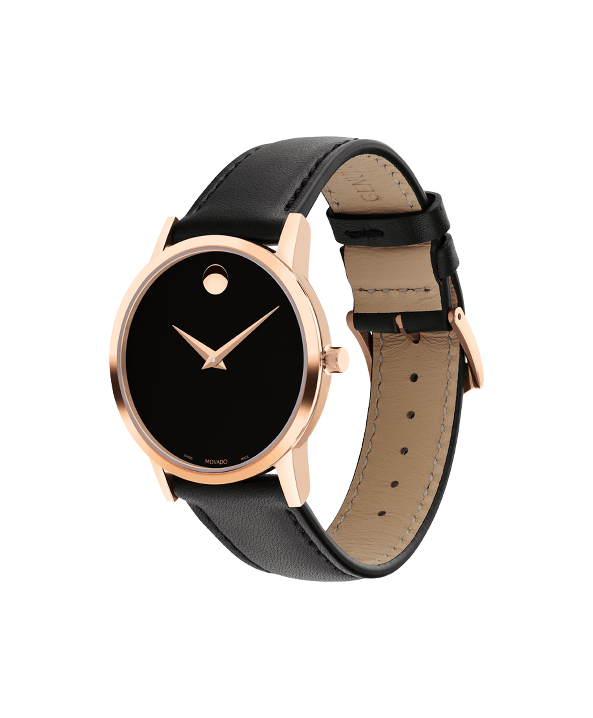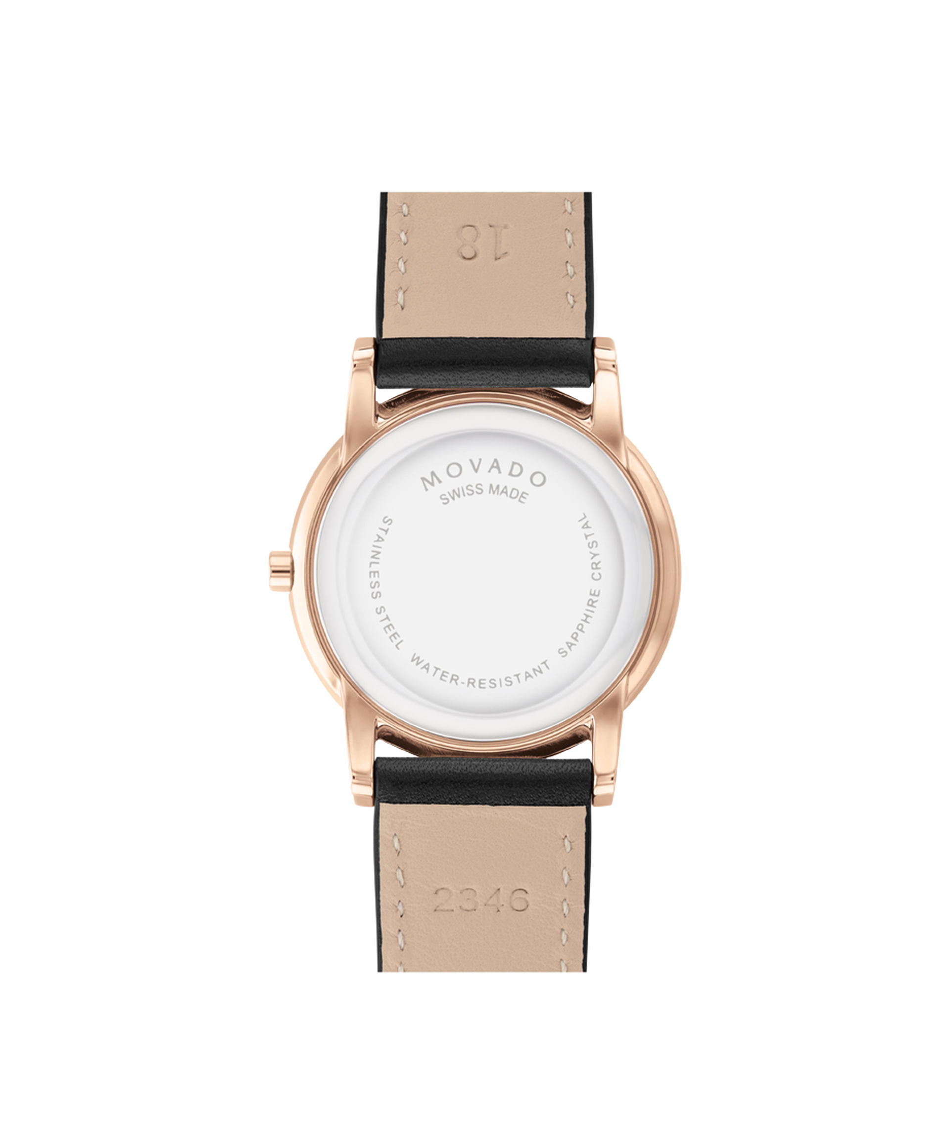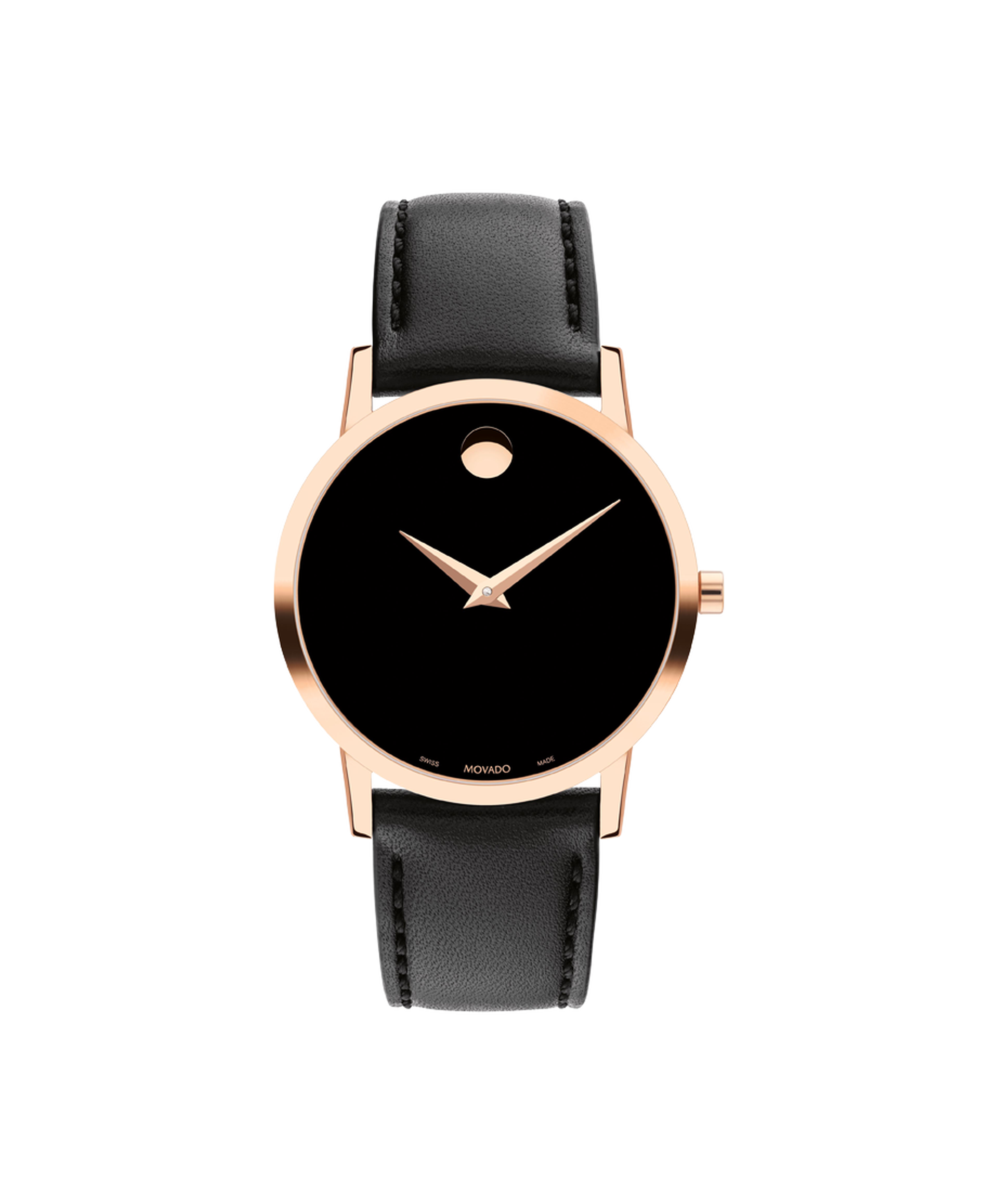 Movado Museum Classic, 33mm rose gold PVD-finished stainless steel case with black Museum dial on a black calfskin leather strap.