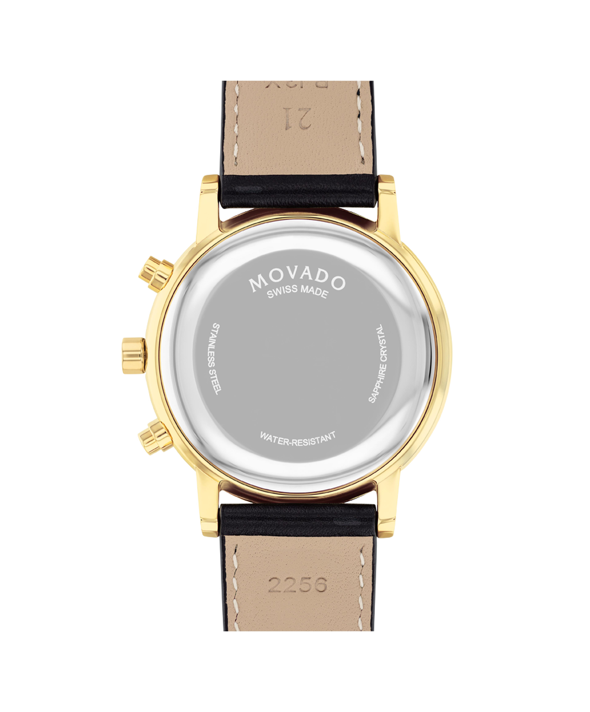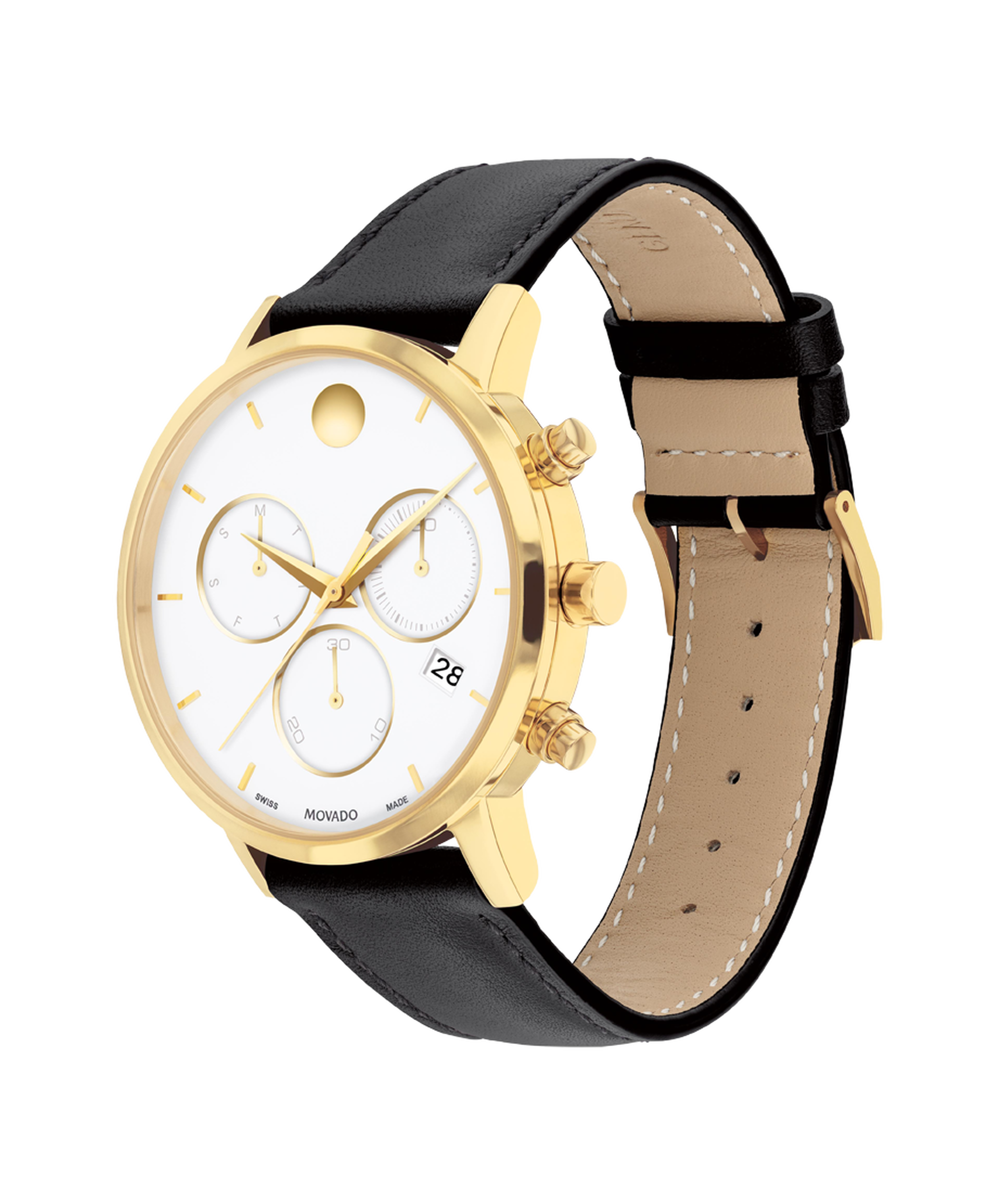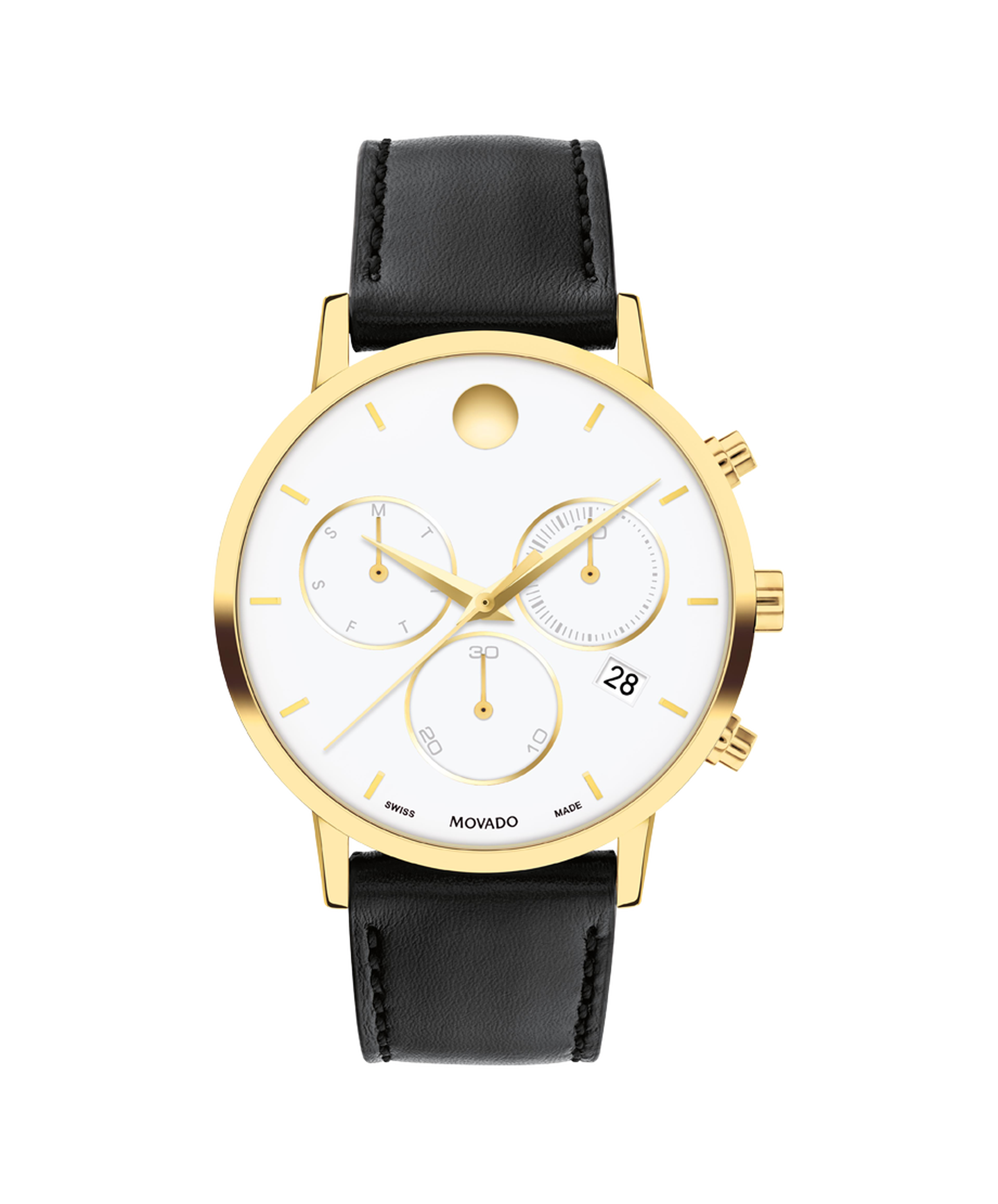 The Museum Classic is an icon of modern design featured in art institutions around the world. This 42mm chronograph watch features a white dial, tonal subdials, yellow goldtone dauphine hands, and our signature museum dial with a dot at 12 o'clock.