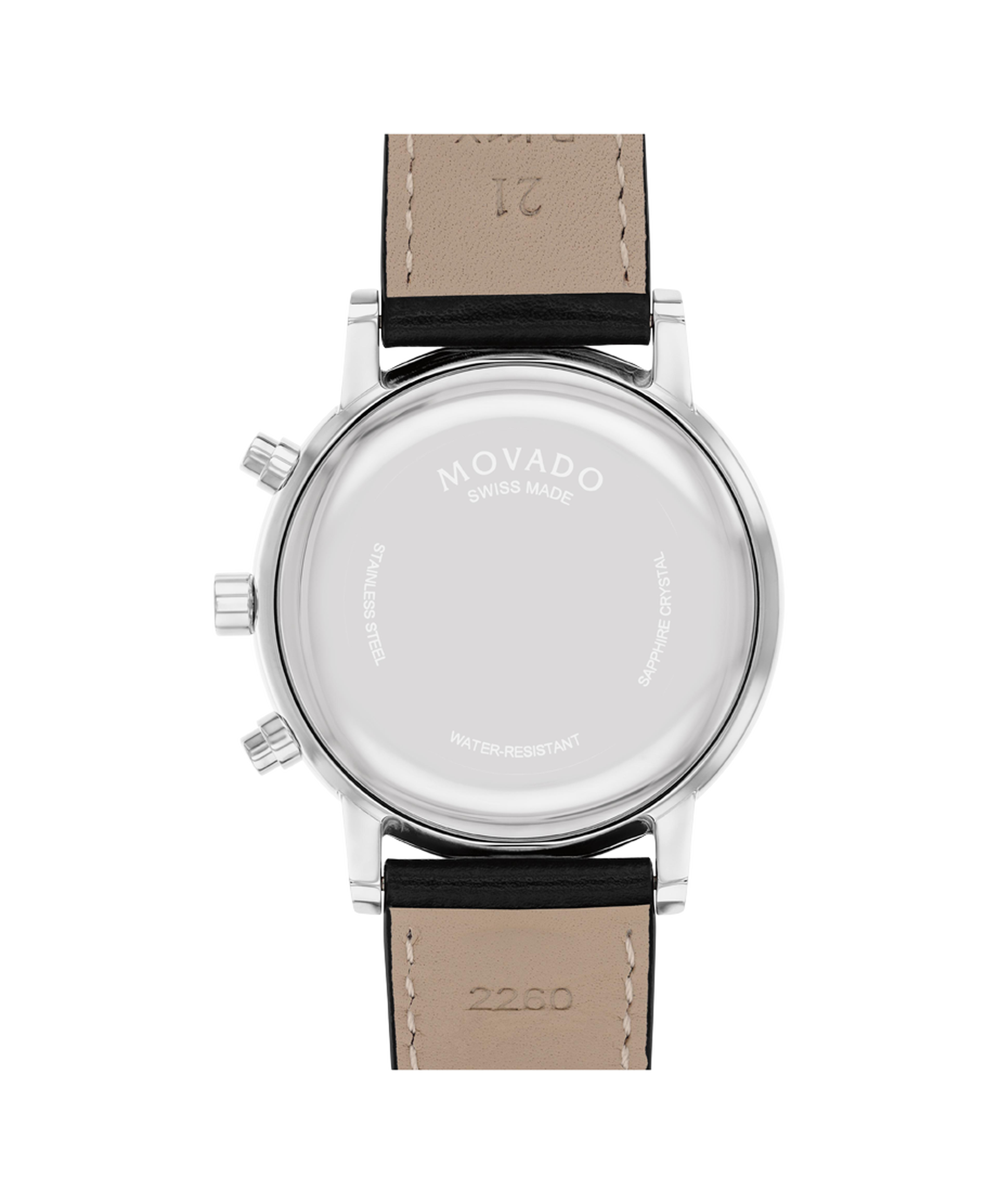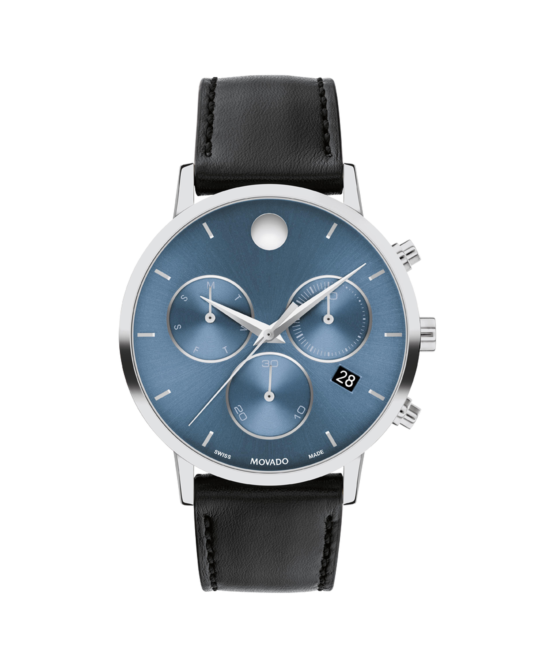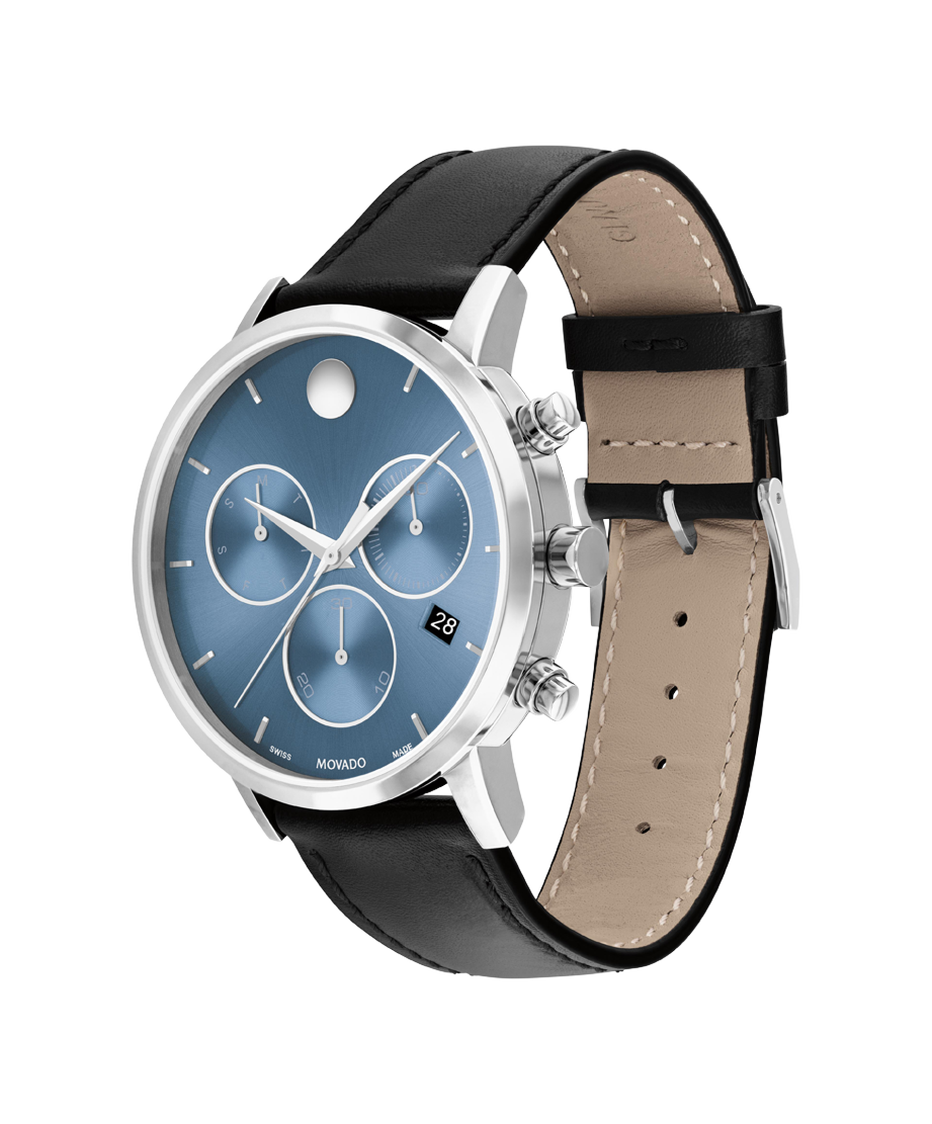 The Museum Classic is the purest interpretation of Movado's Museum Dial—an icon of modern design featured in art institutions around the world. This 42mm chronograph watch features a steel blue dial with tonal subdials, a black leather strap, and our signature dot at 12 o'clock.