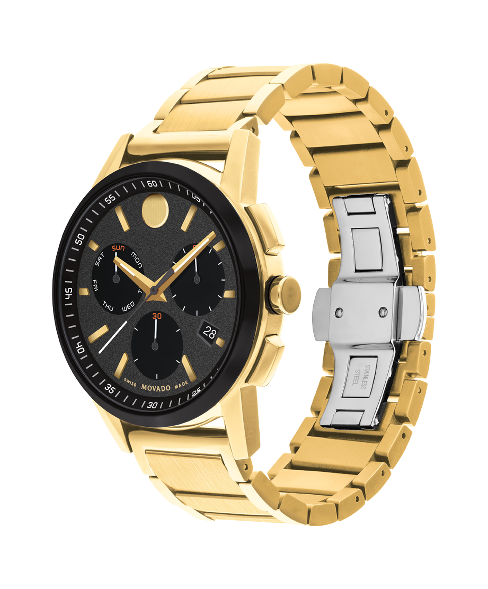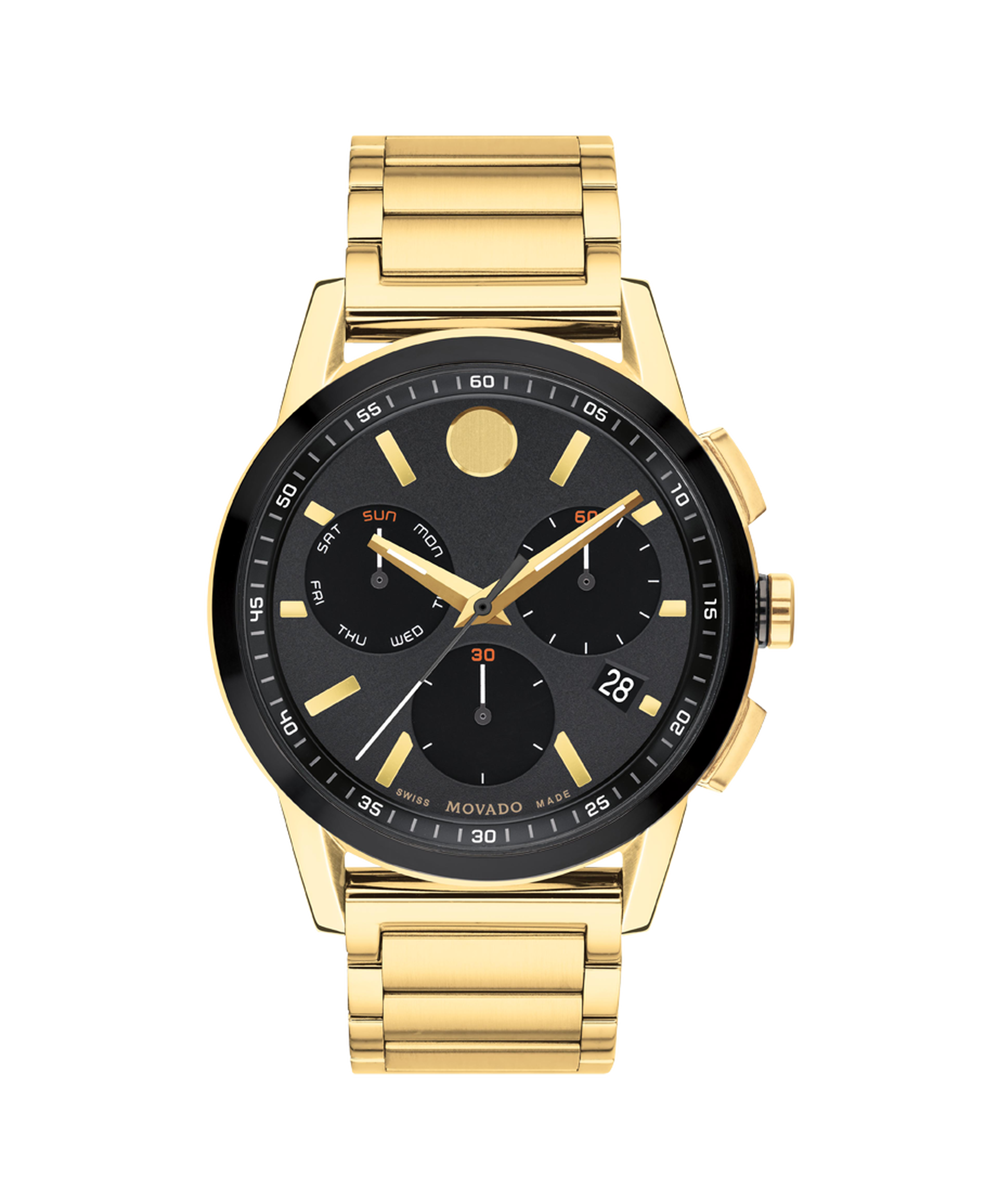Iconic design meets sporty style. We’ve paired the modern aesthetics of our signature Museum Dial with sporty details to create the height of contemporary style. Crafted from rugged stainless steel with a gleaming yellow gold PVD finish, this watch boasts a 43mm case with a glossy black bezel.