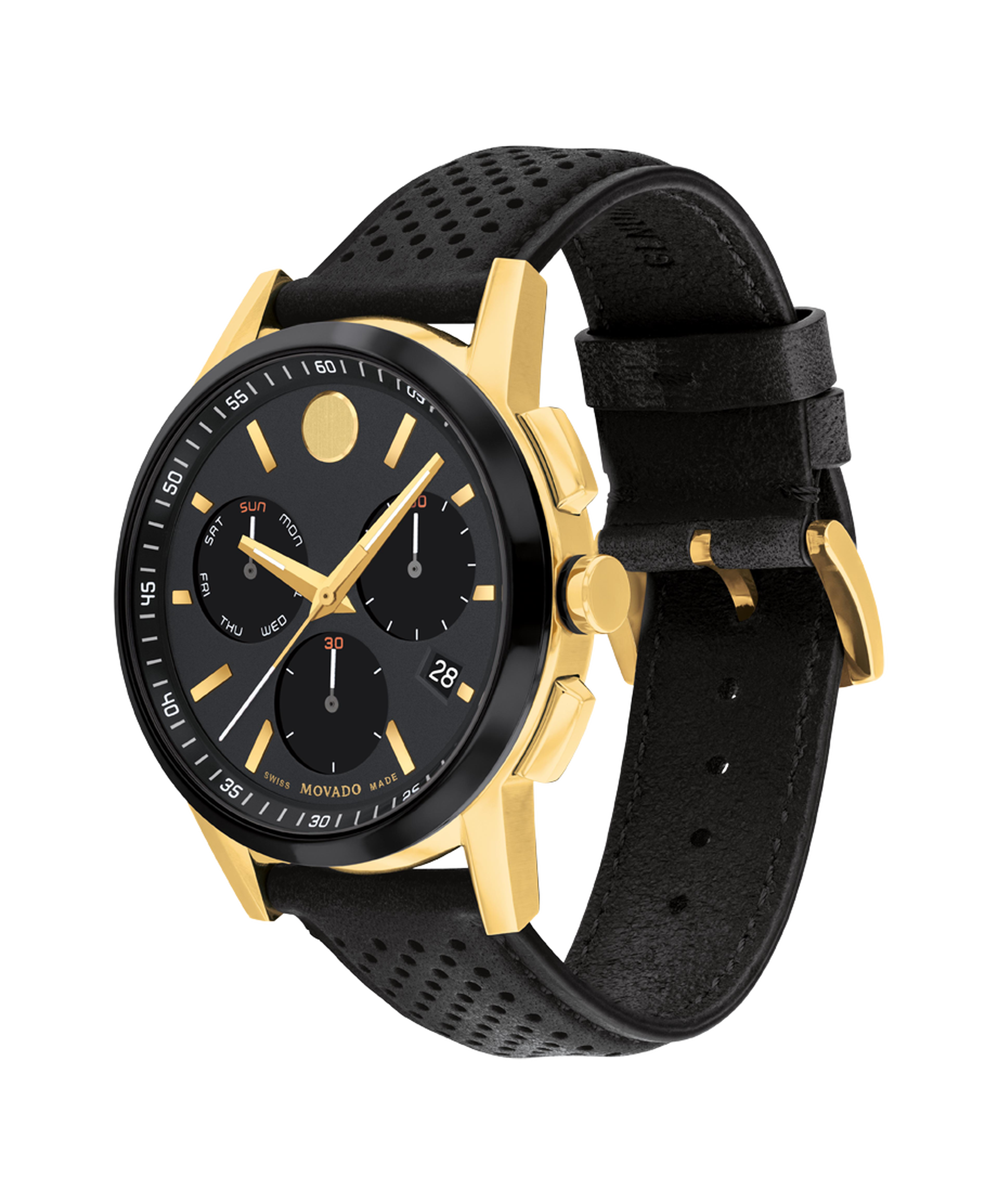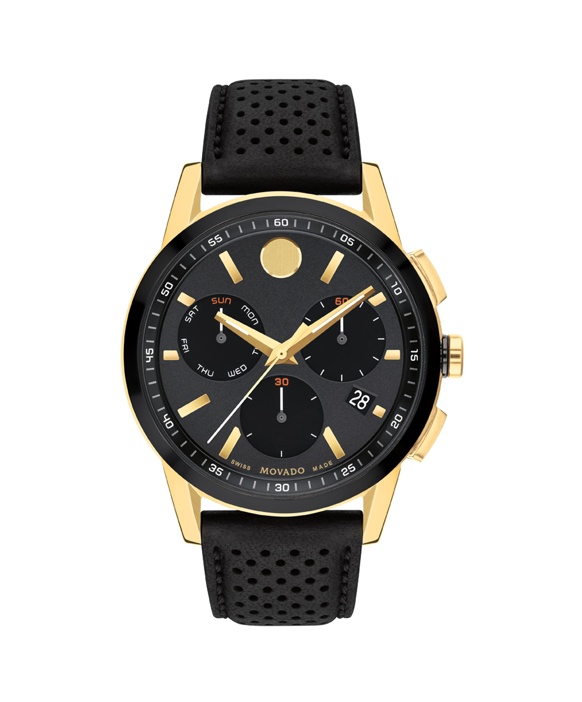 The Museum Sport introduces a sporty minimalist chronograph to our most iconic design. This 43mm chronograph watch features a black textured dial, Swiss Super-LumiNova® accents, and our signature dot at 12 o'clock.