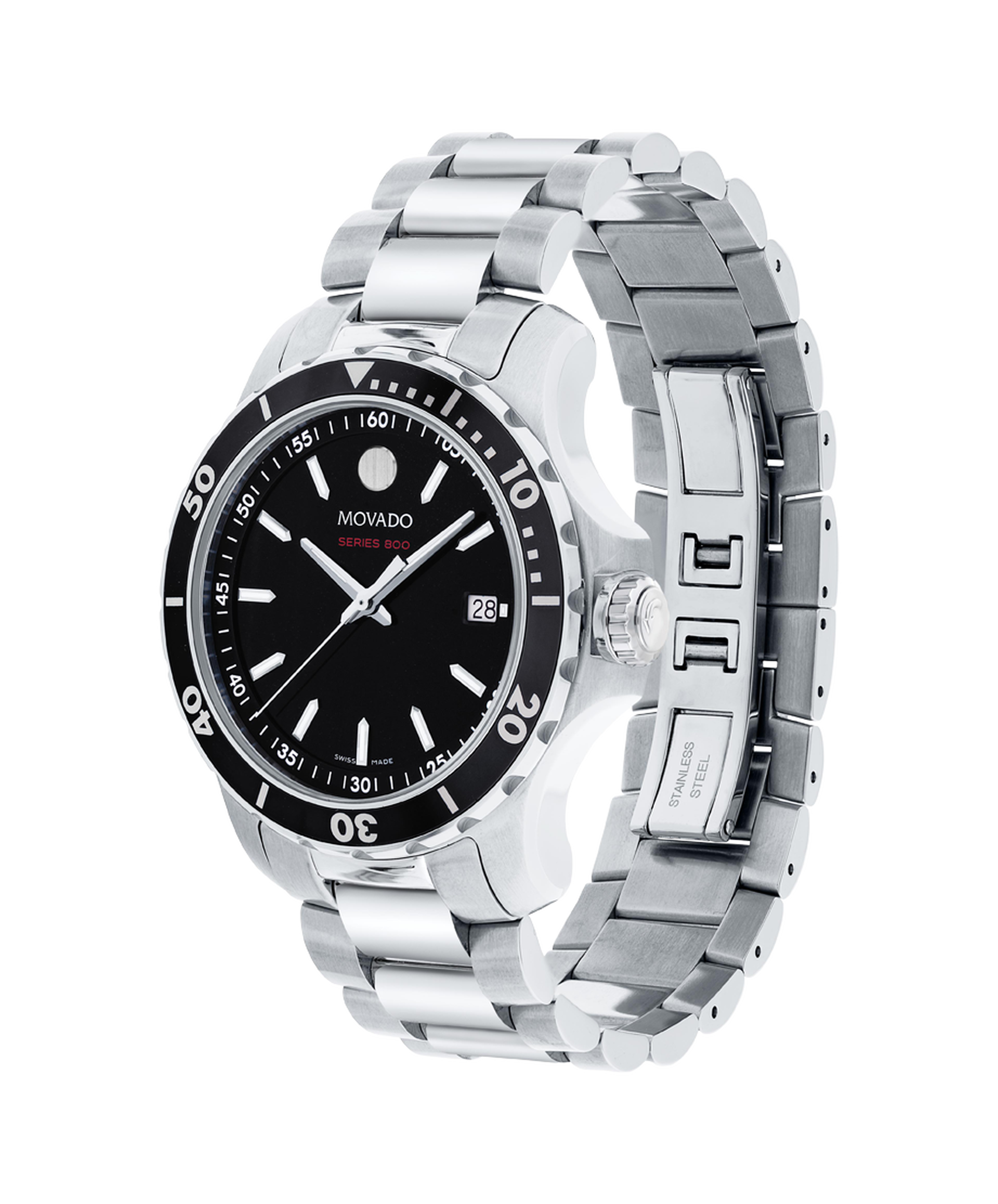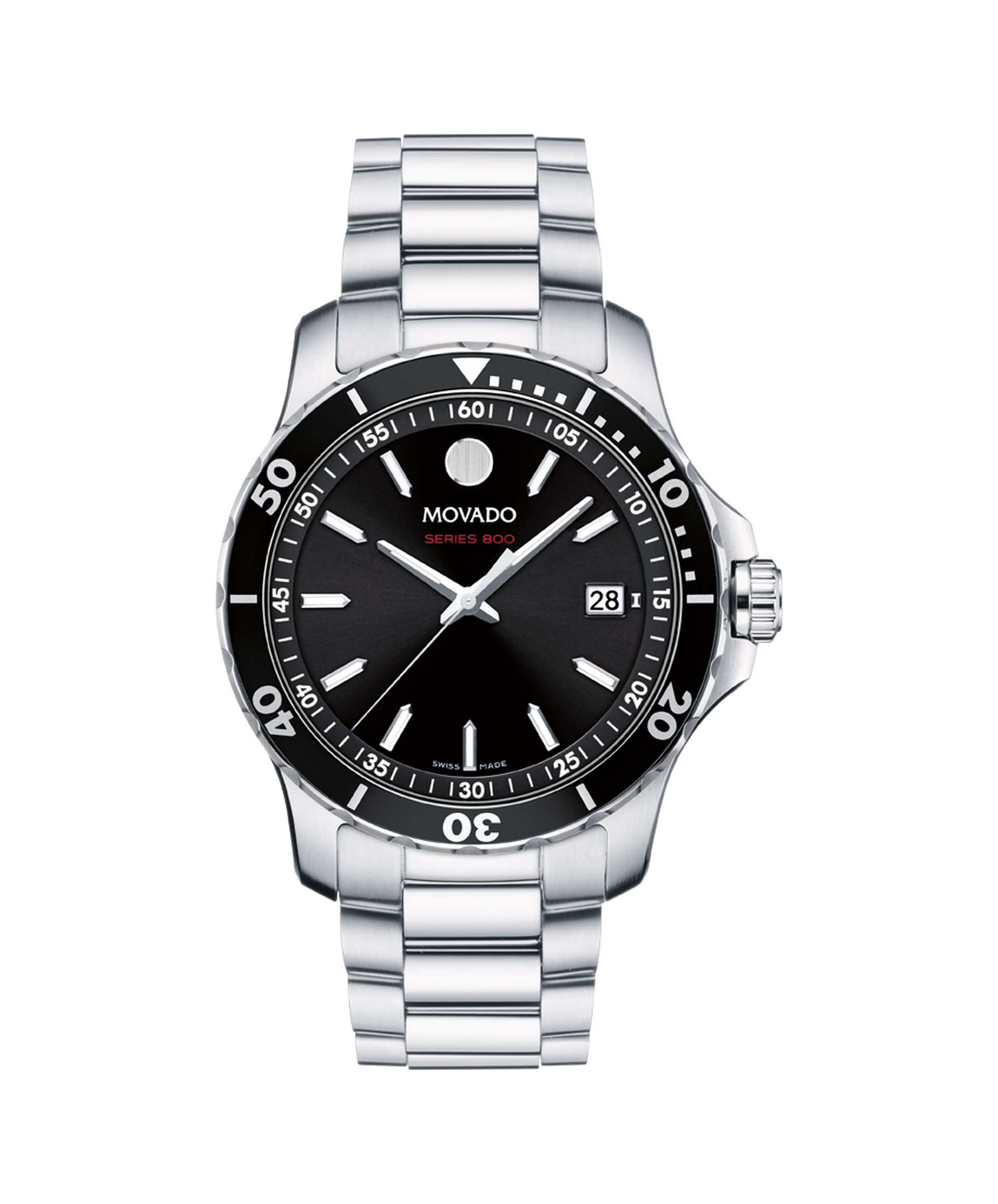 Movado Series 800, 40 mm Performance Steel case and bracelet with black-toned dial.