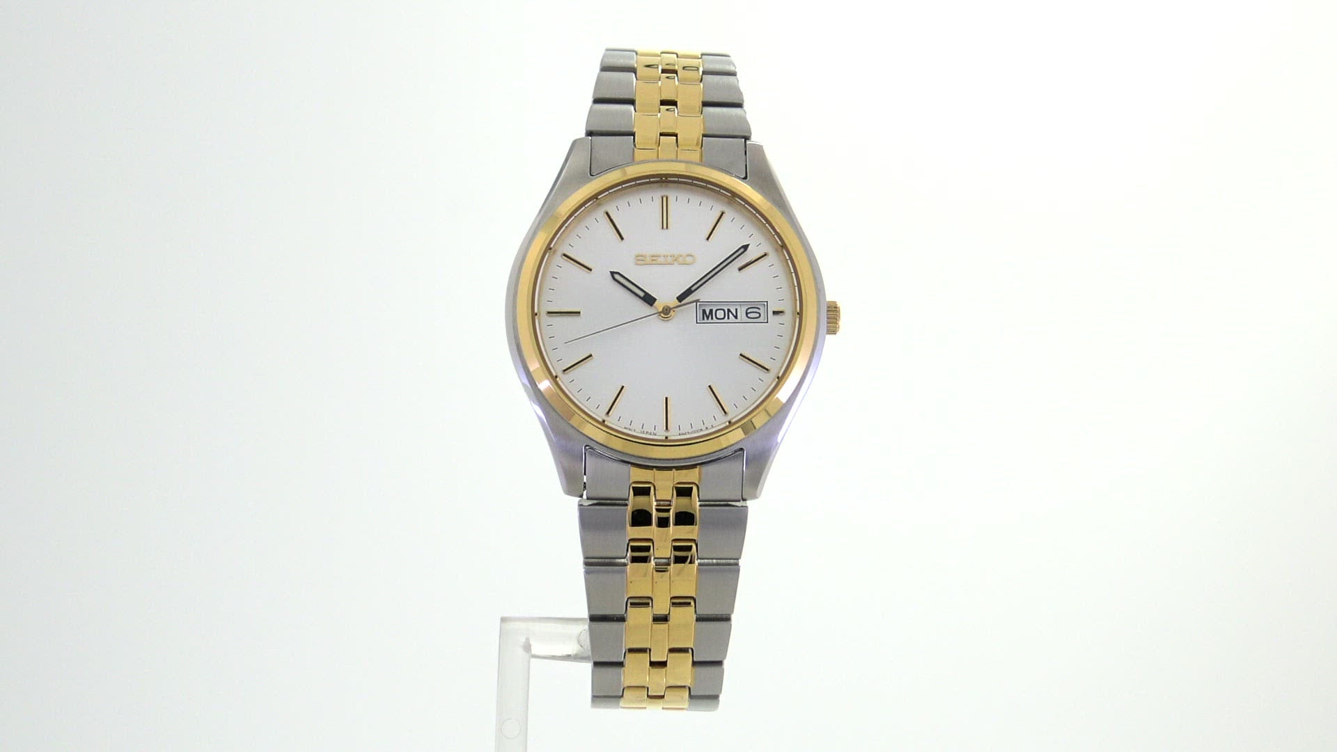 From the Essentials Collection. Offering classic dress/sport designs, the Essentials Collection provides the ideal solution for everyday wear. Crafted of stainless steel in versatile two-tone finish, this perfectly balanced watch features a white sunray dial with day/date calendar and sleek gold stick markers for a superb blend of clarity and style. 10 bar, 100M Water Resistant