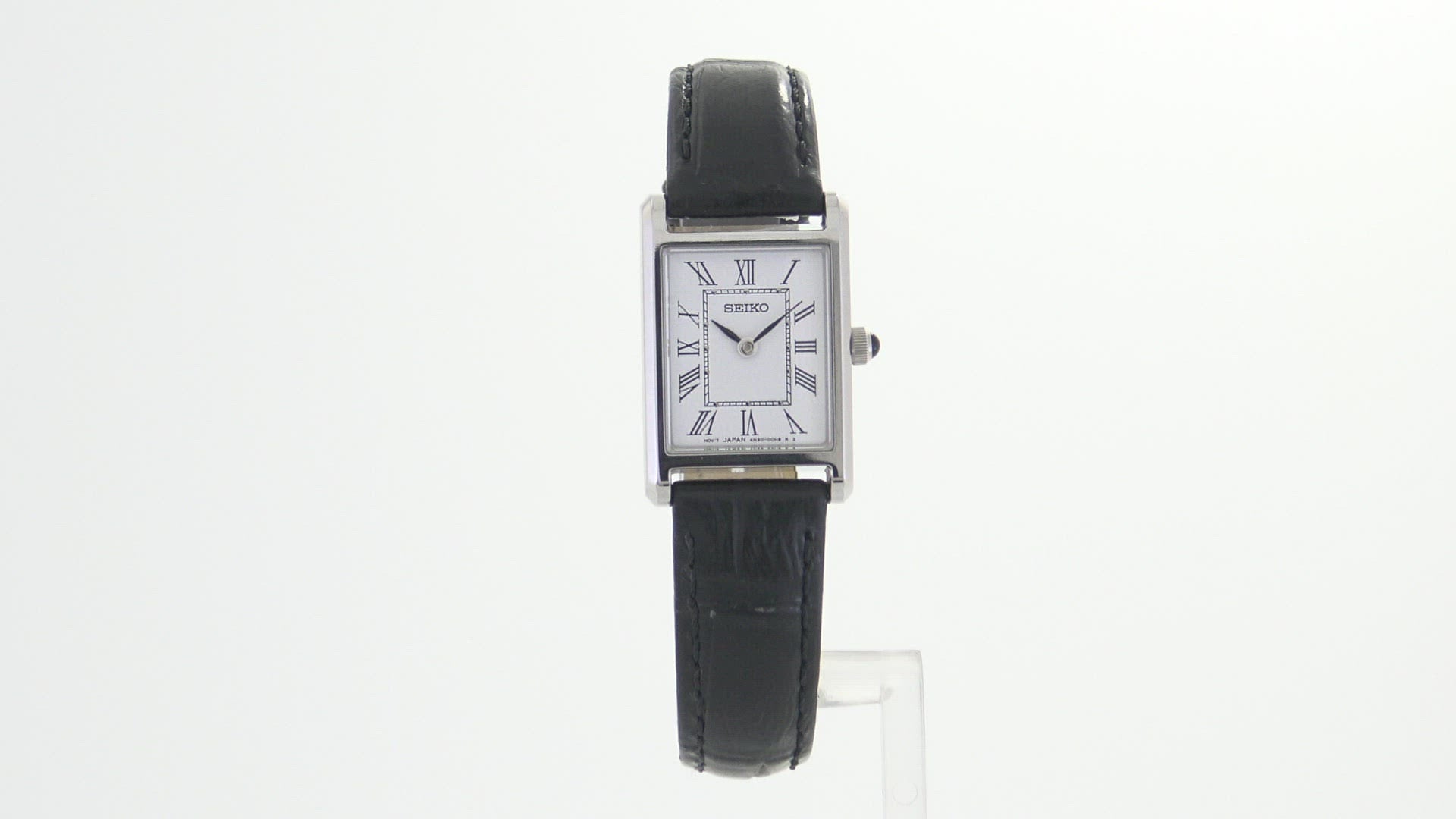 From the Essentials Collection. Offering classic designs, the Essentials Collection provides the ideal solution for everyday wear. Crafted of stainless steel, this elegant watch, with sophisticated rectangular case, features a traditional white dial with Roman numerals and finely shaped hands, cabochon crown and black leather strap for perfect day-to-evening style. 3 bar, 30M Water Resistant