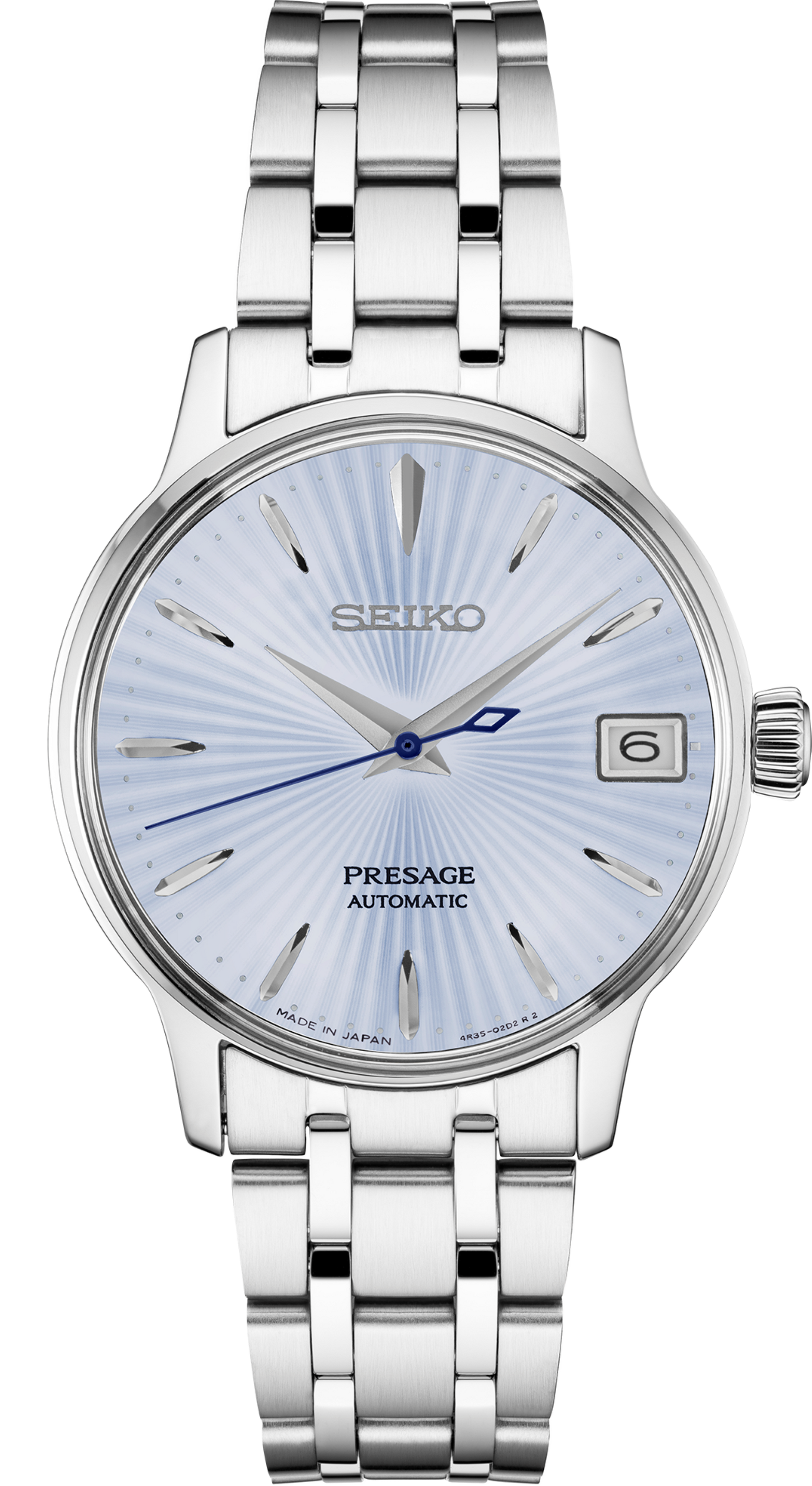 From the Presage Cocktail Time Collection. Offering the finest in Japanese mechanical watchmaking, the Presage Collection blends precision technology with superior craftsmanship and design. Inspired by the delights of a cocktail bar, this sophisticated watch features a pressed pattern, gloss finish and date calendar pink dial with pressed pattern, gloss finish and date calendar. The 23-jewel movement, with manual and automatic winding capability, beats at a frequency of 21,600 vibrations per hour, with a power reserve of approximately 41 hours. Crafted of stainless steel, this elegant timepiece includes a box-shaped crystal, screwdown see-through caseback, and double deployment clasp with push button release. 5 bar, 50M Water Resistant *From the Presage Cocktail Time Collection*Fine mechanical watchmaking from Japan*Manual and automatic winding capabilities*21, 600 vibrations per hour*Power reserve: approximately 41 hours*23 jewels*Pink dial with pressed pattern and gloss finish*Date calendar*Box-shaped crystal*Screwdown see-through caseback*Case diameter: 33.8mm*Stainless steel case and bracelet*Double deployment clasp with push button release*Water-resistant to 5 bar, 50 meters (165 feet)*Caliber 4R35*