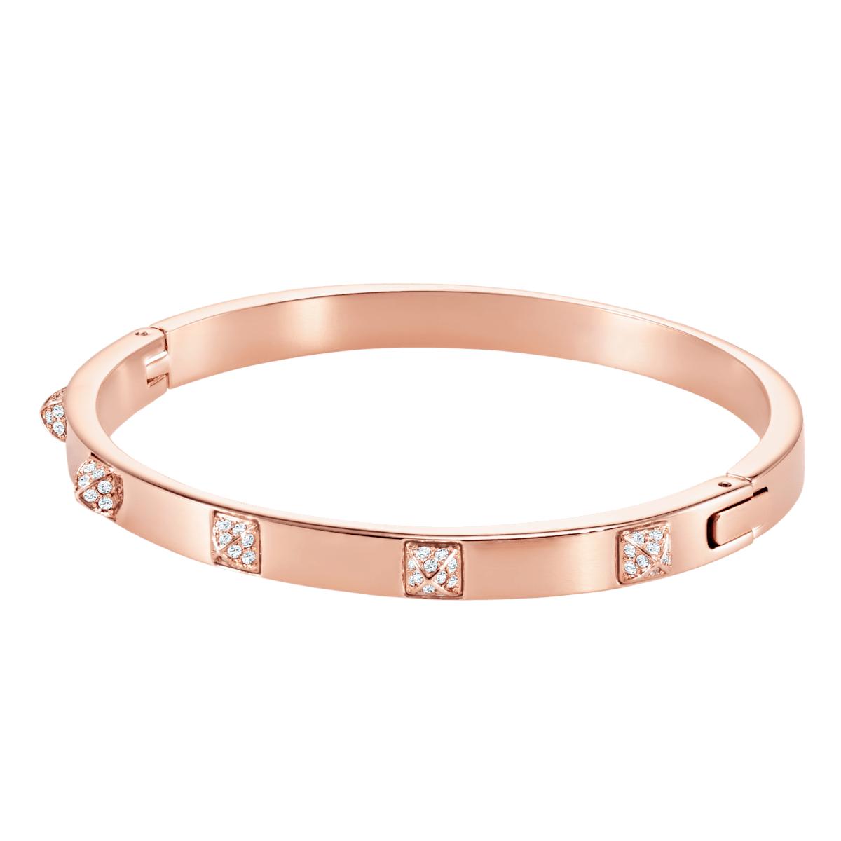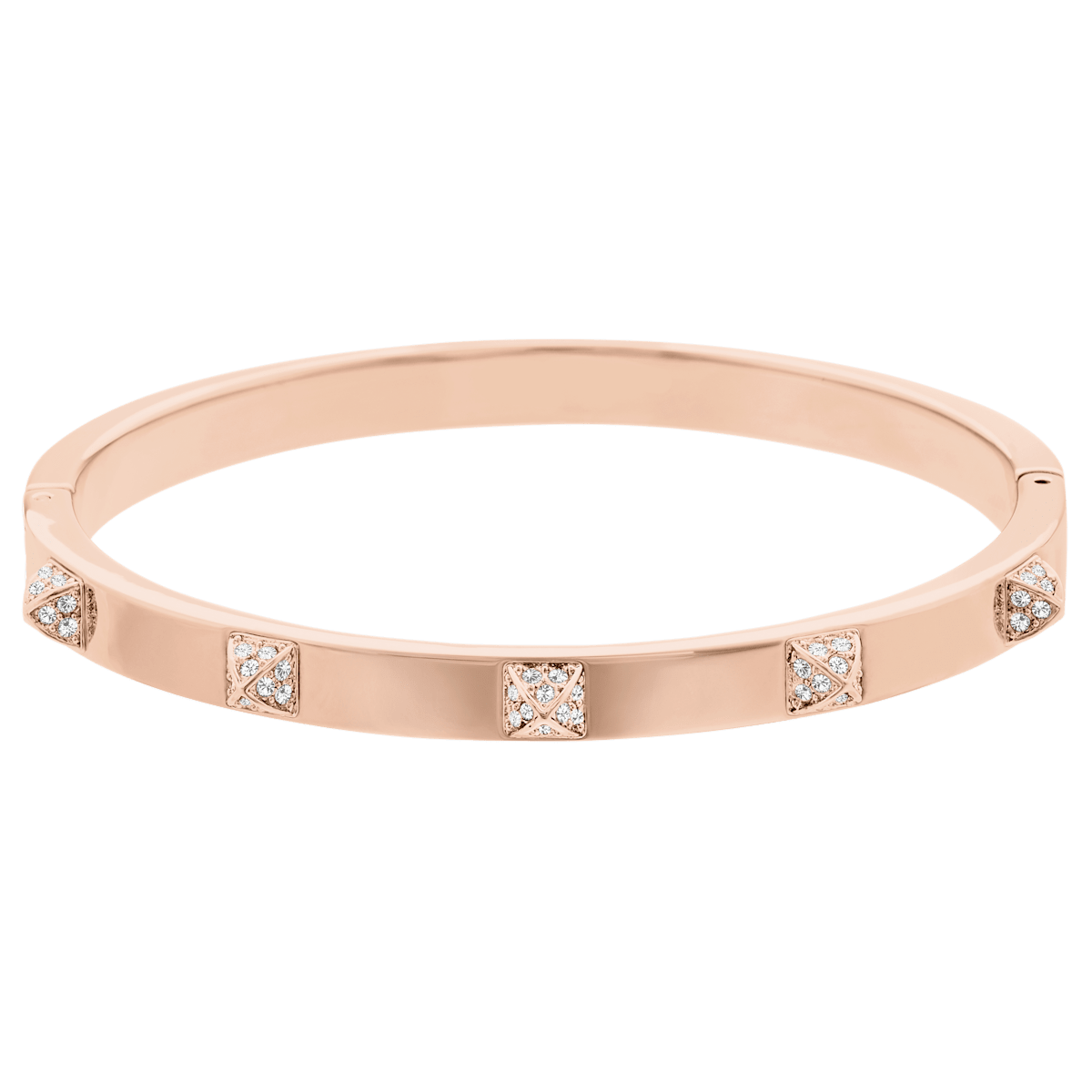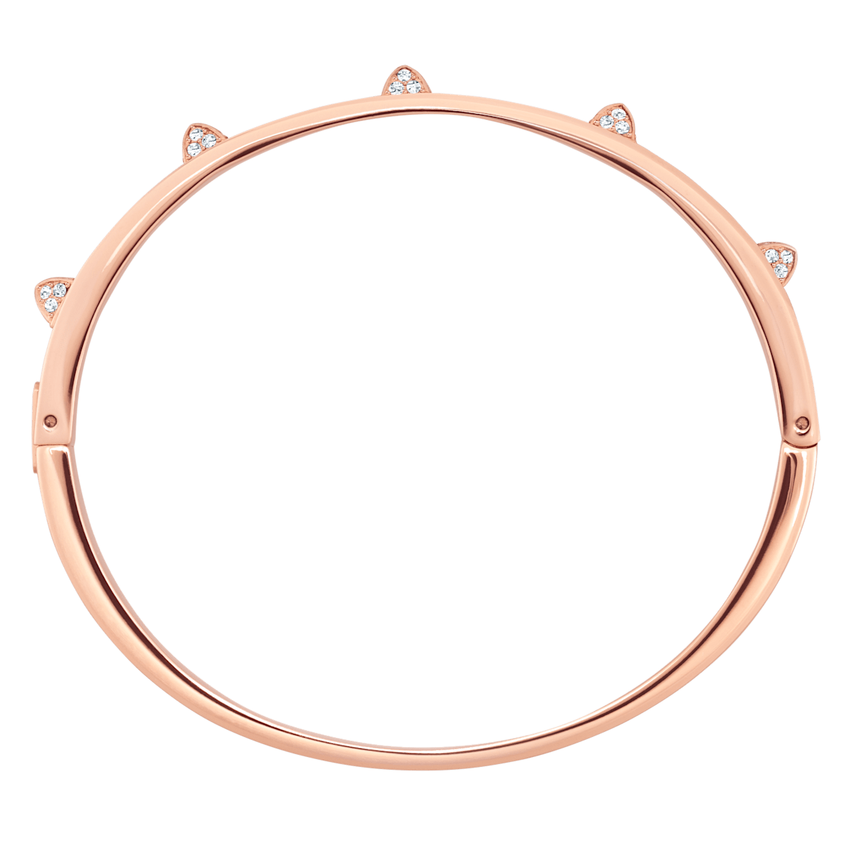 Ideal for fashion lovers! This rose gold PVD bangle honors the thin bangle and spike trends. Embellished with clear crystal pavé, its sleek and modern silhouette combines well with other bangles or bracelets to create an on-trend stacked look.