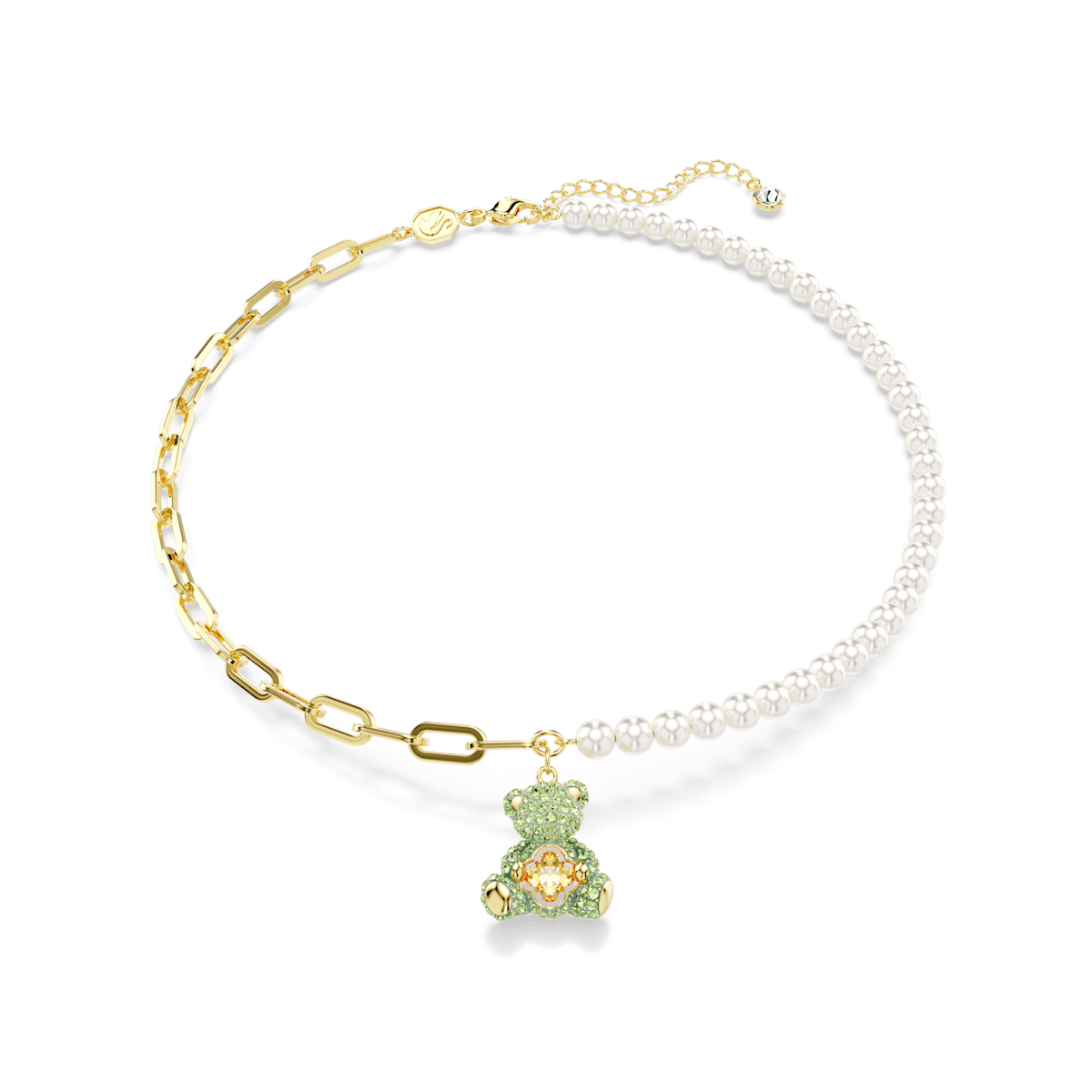 Raise a smile with this playful teddy bear pendant. The heart-warming design is worn on a necklace of Swarovski Crystal Pearls and a gold-tone plated chain with a teddy motif embellished with green crystals. At its center, the teddy holds a yellow Swarovski Zirconia dancing stone that provides constant light-catching motion. Wear yours with a matching bracelet to complete the set.