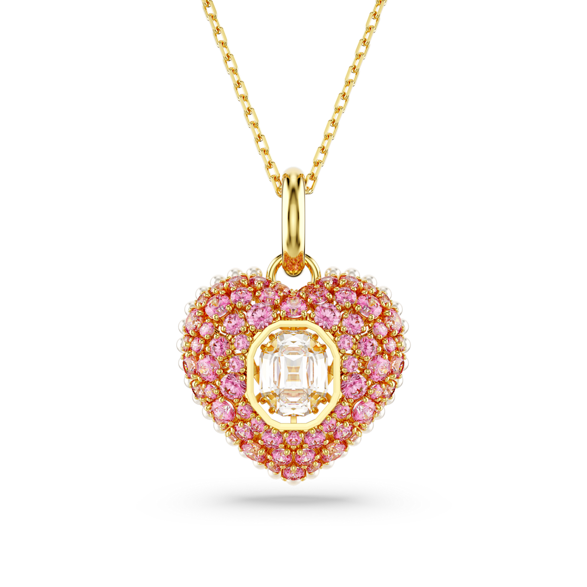 Let your heart be captured by this striking Swarovski pendant. The gold-tone plated motif has been created with a cage design for maximum volume and features an array of tiny white Crystal Pearls around the edging. To enhance the domed effect, it is adorned with round pink Swarovski Zirconia, set in place using the dazzling chatonnage technique, while at the center, an octagonal dancing stone catches the light from every angle. Gift this as a special surprise to someone you adore.