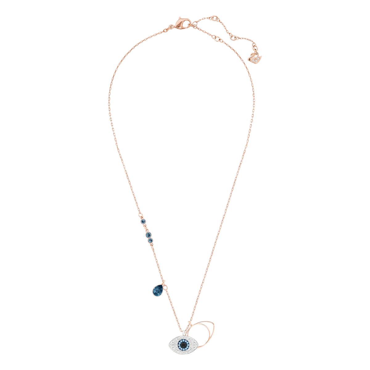 The mixed-plated Duo Pendant Evil Eye adds a mystic touch to any look. It features one eye motif in blue, black, and clear crystal pavé and one in rose gold-plated metal. The pendant comes on a rose gold-plated chain embellished with dark blue crystals.