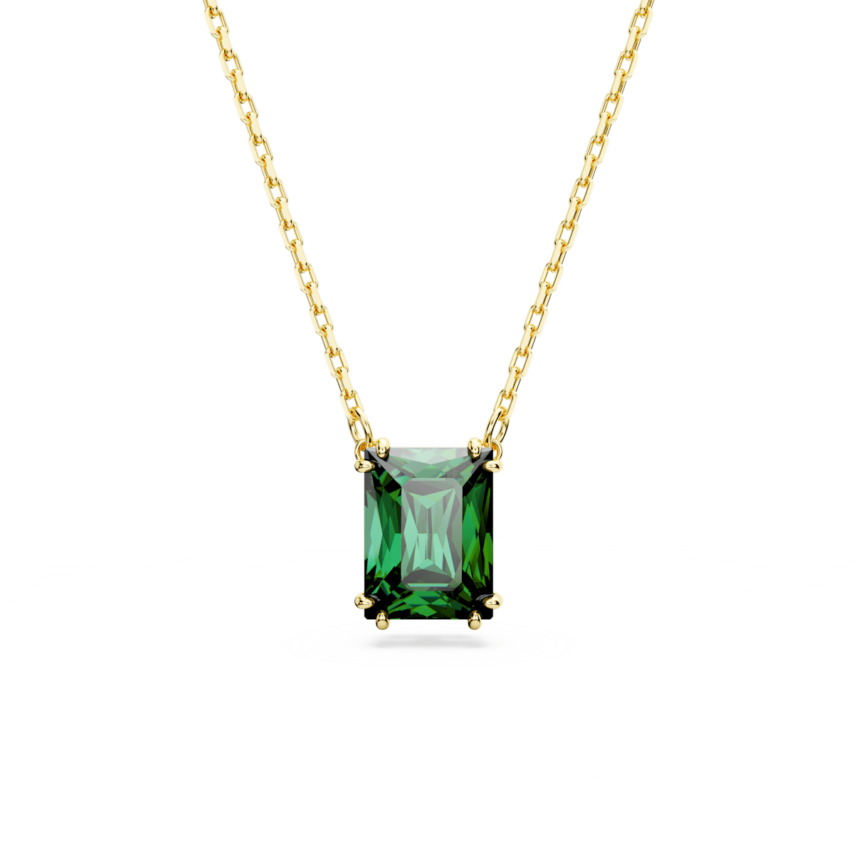 The extraordinary elegance of the Matrix family is captured in this beautiful pendant. A rectangular Swarovski Zirconia in an energizing emerald hue sits in a refined double prong setting. It comes on a long, gold-tone plated chain with a lobster closure. Wear this faceted piece to catch the light and reflect your inner strength.