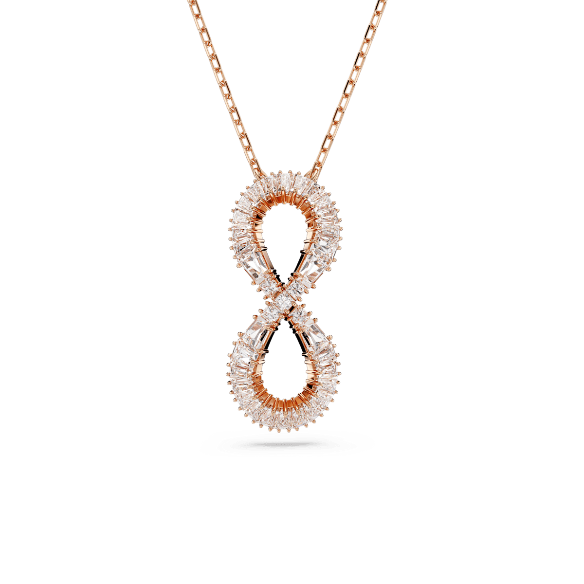 Embrace timeless style with this dazzling Hyperbola pendant in the shape of an infinity symbol. The rose gold-tone plated jewelry is worn on a delicate chain, with its vertical motif embellished with clear Swarovski Zirconia. A single Swarovski Zirconia is also placed in the elongation for an extra touch of luxury. A piece that is ideal for everyday elegance.