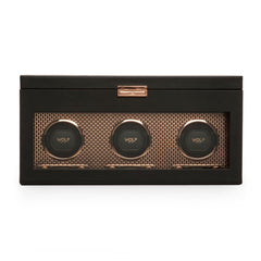 Powder-coated and copper-plated laser cut perforated steel melded with clean, sleek lines. the Axis collection drives a modern, bold look for safekeeping your timepieces. Our patented technology of counting rotations of the axis of your watch guarantees precise Turns Per Day.