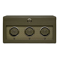 The Earth Triple Watch Winder, from the 190th anniversary collection, brings together innovative design, elegance and sustainability. Featuring an apple leather exterior with toning matt metallic hardware and bezels combined with a recycled jacquard silk interior with the WOLF signature pattern. The Dynamic Lock-in Cuff is customisable to three different wrist sizes and locks your watches inside the winder. Individually set the required Turns per Day and direction for your three watches via the WOLF Bluetooth app. In the top storage section find five suspended watch cushions and removable accessory tray with multiple sections for your valuables.