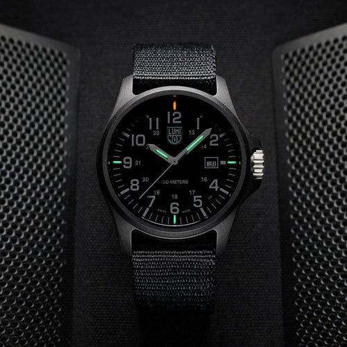 The Green Shield Patagonia collection is inspired by the adventurous spirit of its namesake. A classic timepiece combining rugged yet simple styling with a clean modern look embodies Patagonia's intrepid nature. Housed in a 43mm CARBONOX ™ case, it is water resistant to 100 meters. The black dial features instantly-readable white numbers and comes with a black R-PET belt strap adorned with a stainless steel signature buckle. This watch is equipped with the proven Luminox Light Technology lighting system. "Always Visible", self-powered, for up to 25 years.